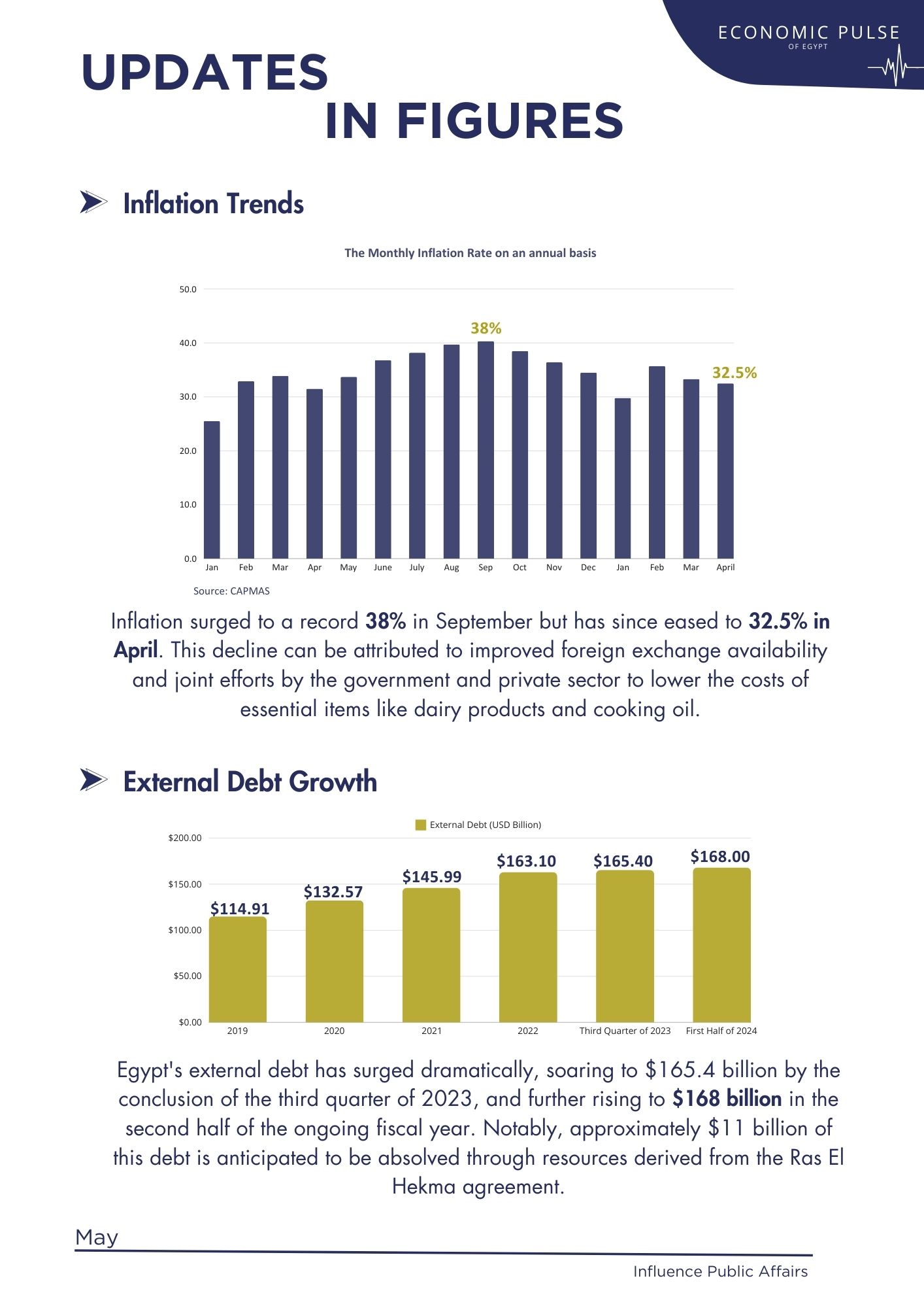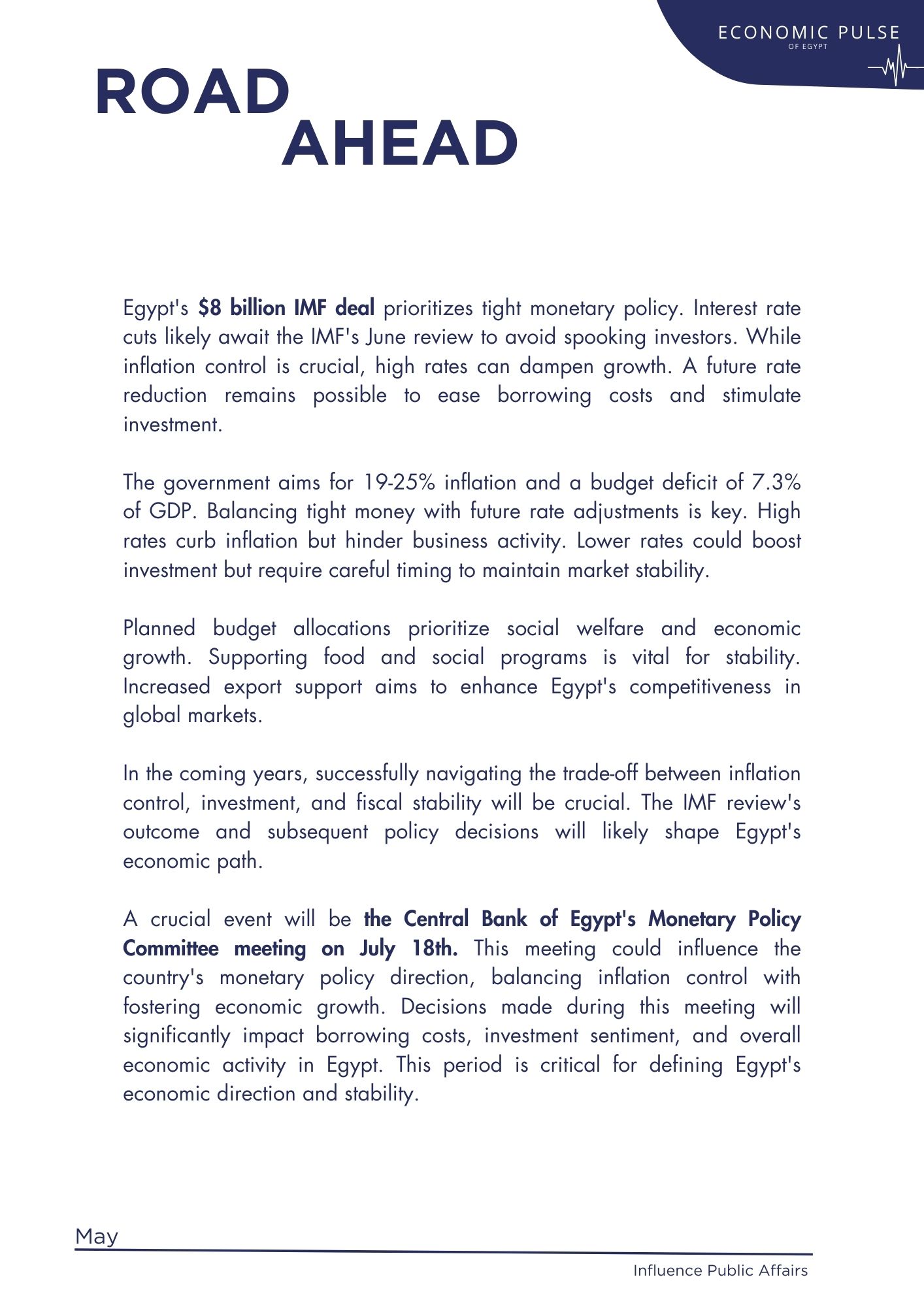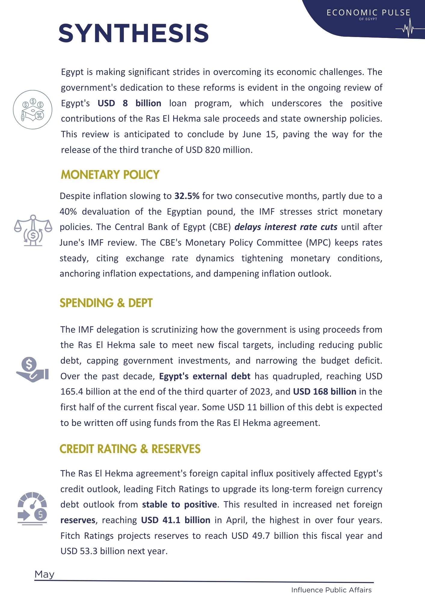 Despite inflation slowing to 32.5% for two consecutive months, partly due to a 40% devaluation of the Egyptian pound, the IMF stresses strict monetary policies. The Central Bank of Egypt (CBE) delays interest rate cuts until after June's IMF review. The CBE's Monetary Policy Committee (MPC) keeps rates steady, citing exchange rate dynamics tightening monetary conditions, anchoring inflation expectations, and dampening inflation outlook.