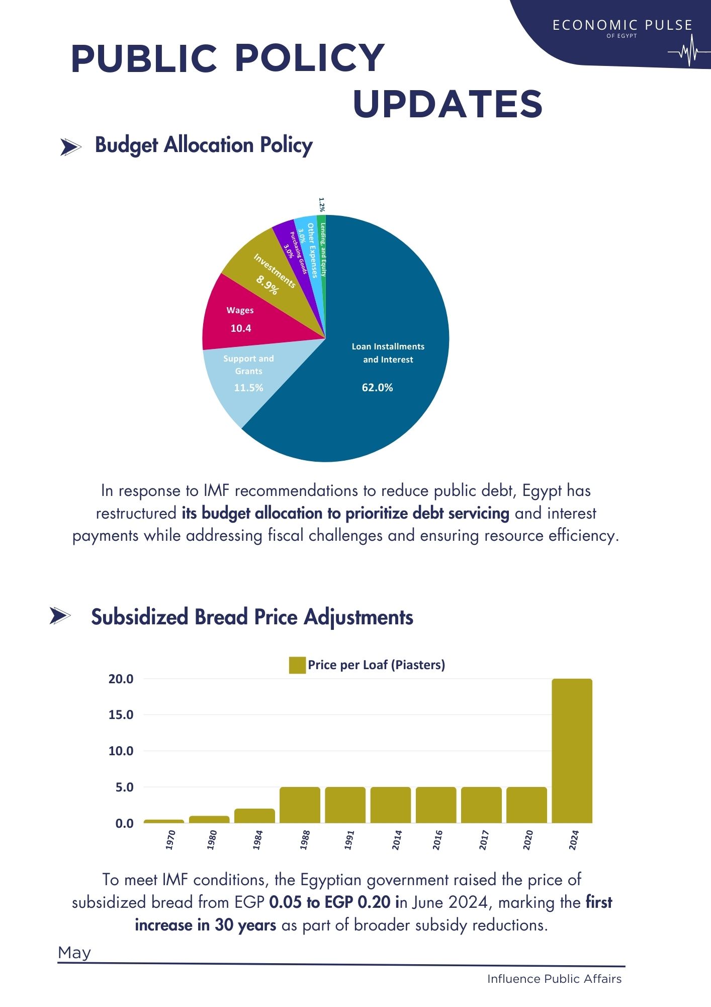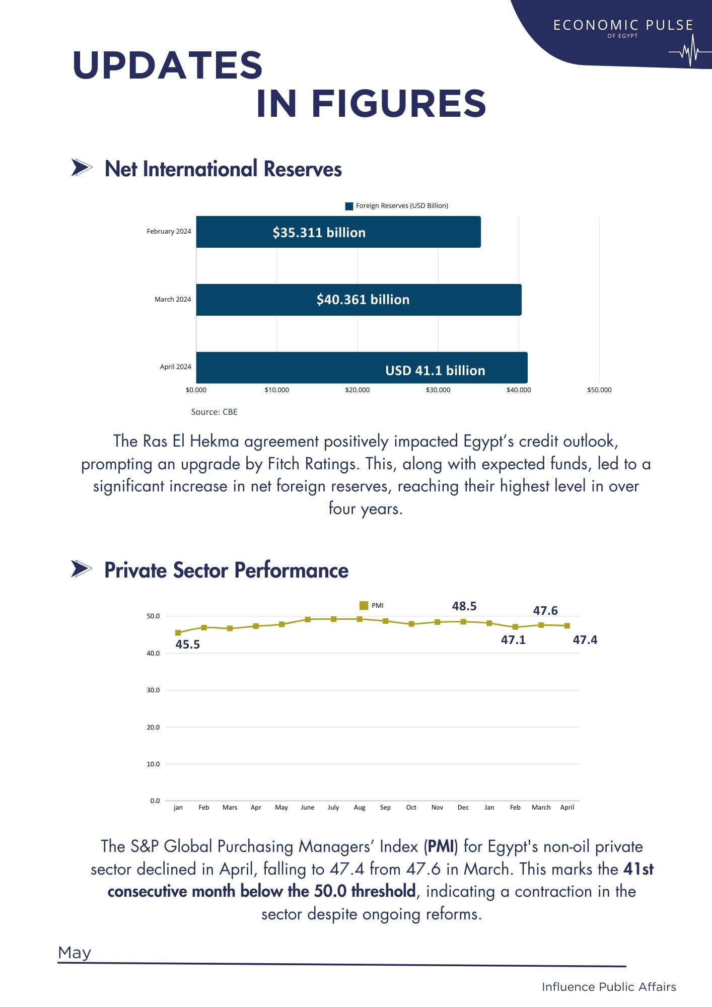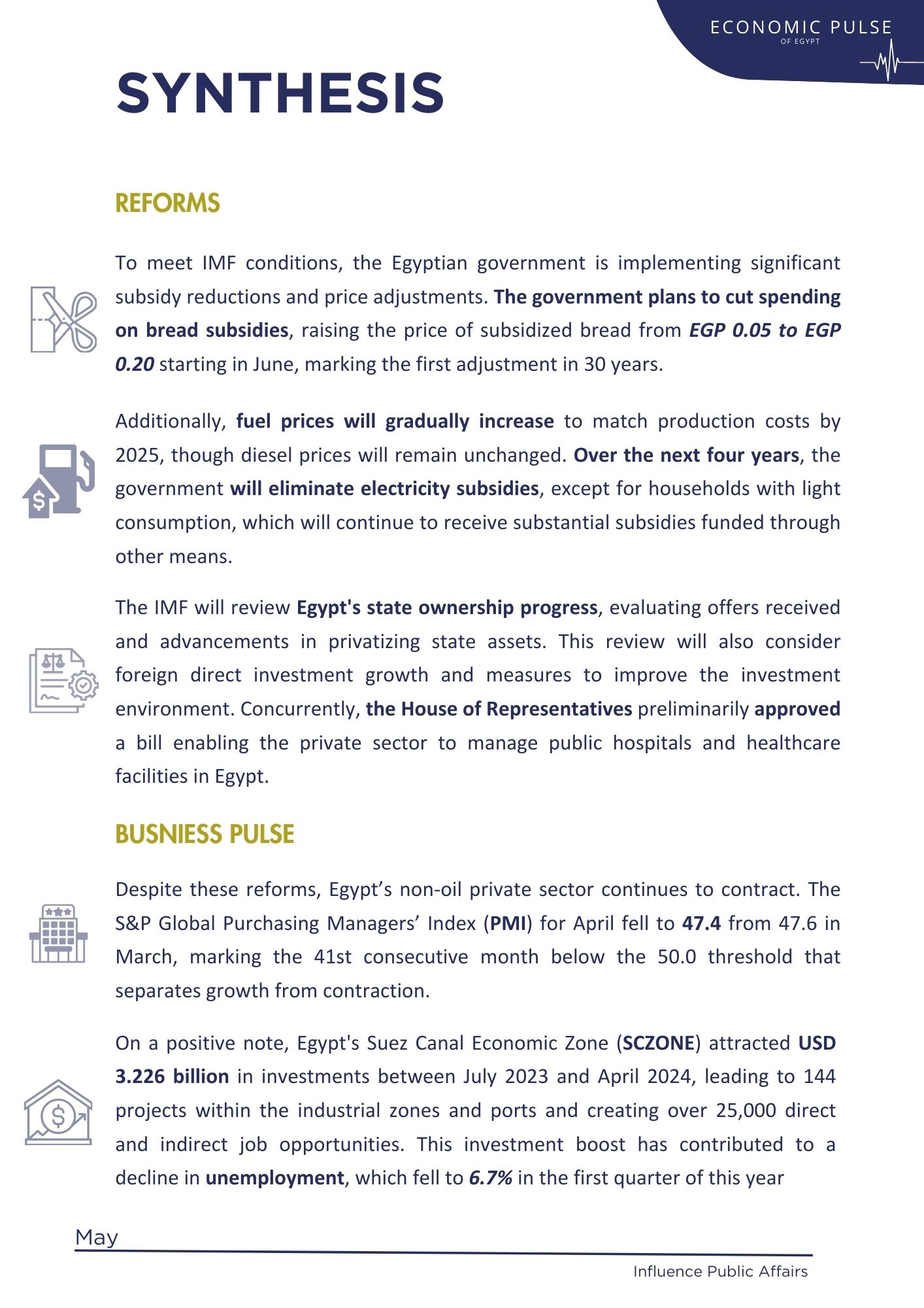 Despite inflation slowing to 32.5% for two consecutive months, partly due to a 40% devaluation of the Egyptian pound, the IMF stresses strict monetary policies. The Central Bank of Egypt (CBE) delays interest rate cuts until after June's IMF review. The CBE's Monetary Policy Committee (MPC) keeps rates steady, citing exchange rate dynamics tightening monetary conditions, anchoring inflation expectations, and dampening inflation outlook.