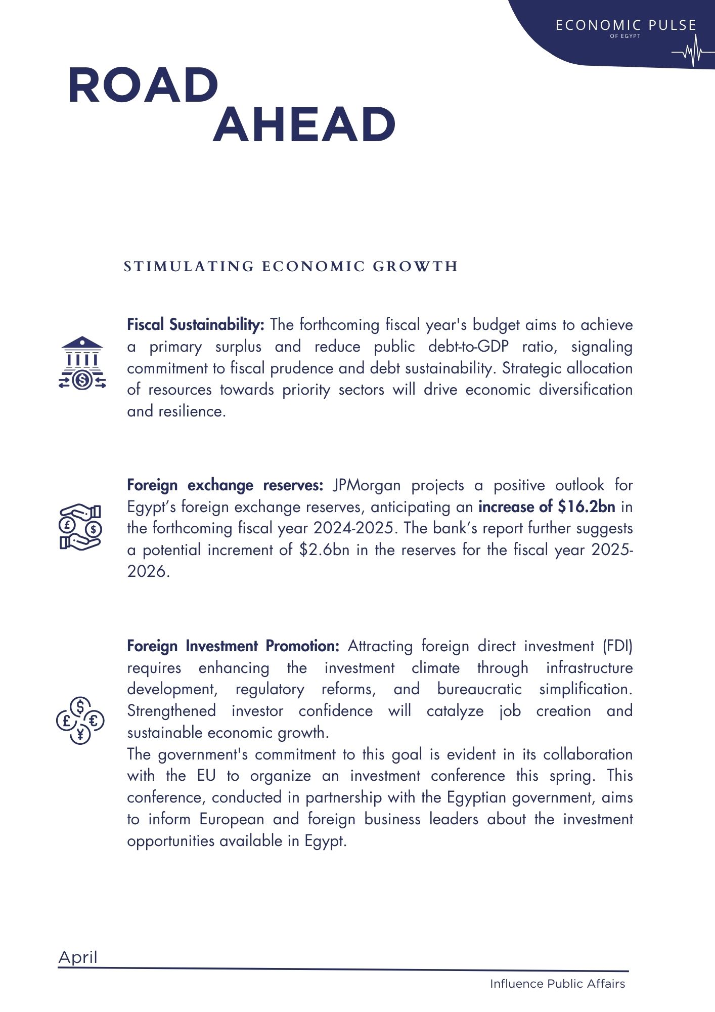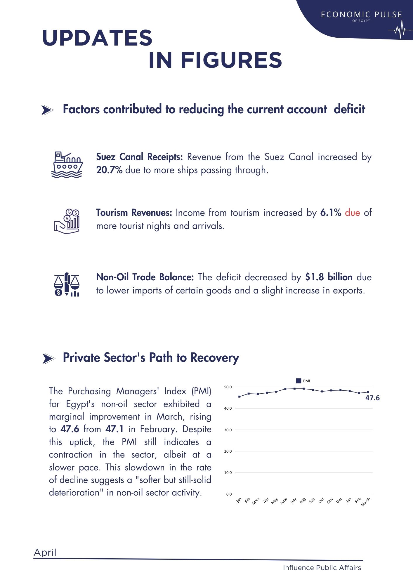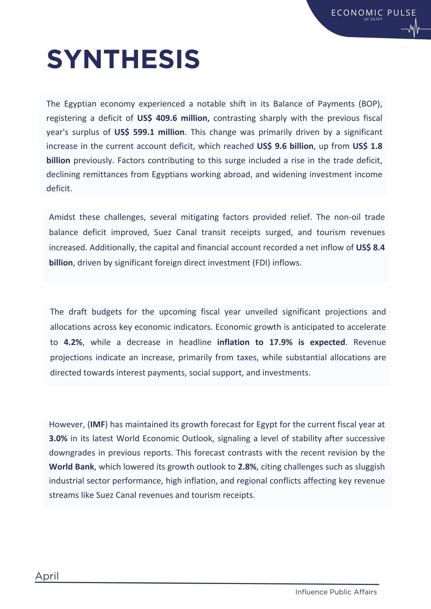 Amidst these challenges, several mitigating factors provided relief. The non-oil trade balance deficit improved, Suez Canal transit receipts surged, and tourism revenues increased. Additionally, the capital and financial account recorded a net inflow of US$ 8.4 billion, driven by significant foreign direct investment (FDI) inflows.