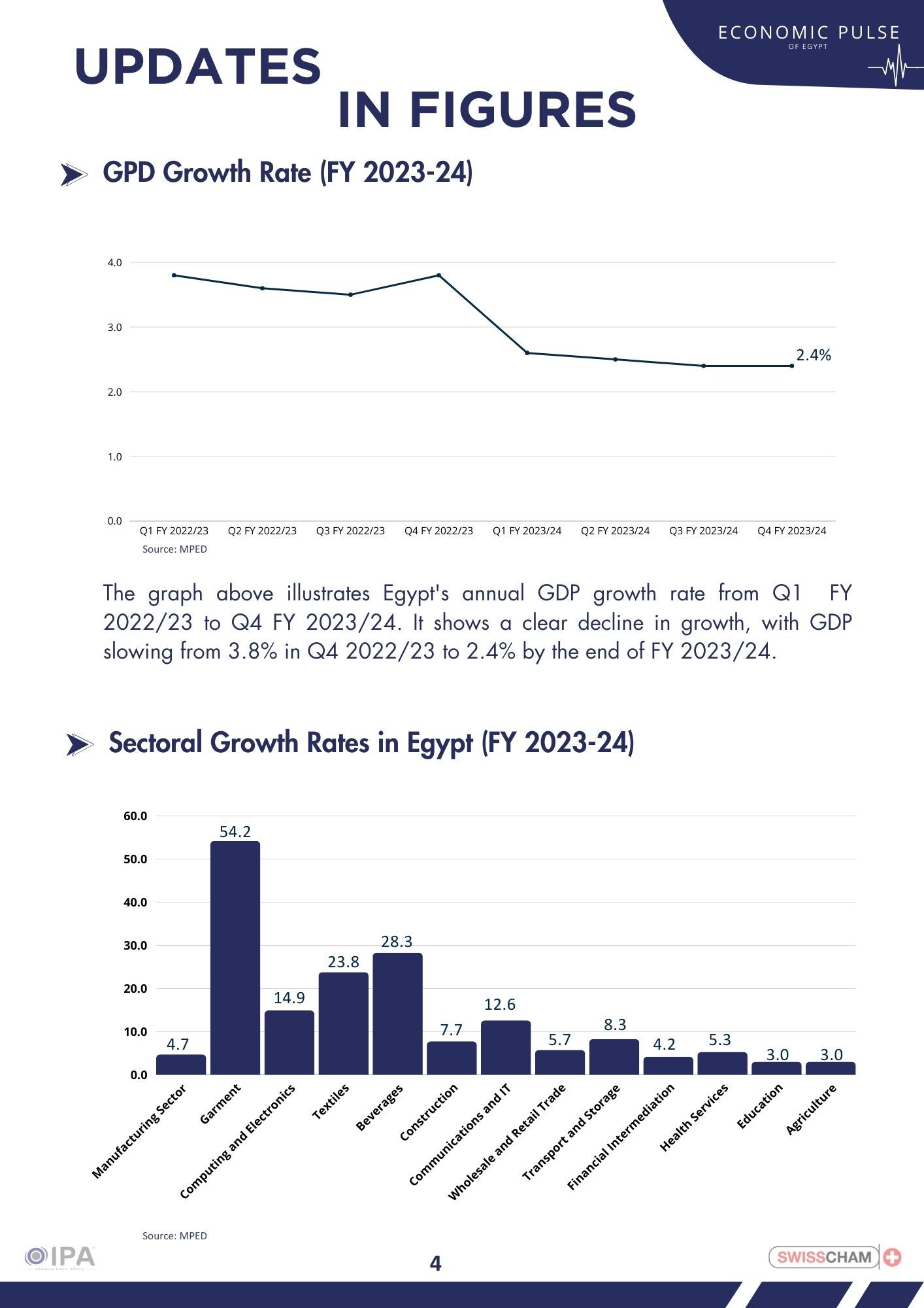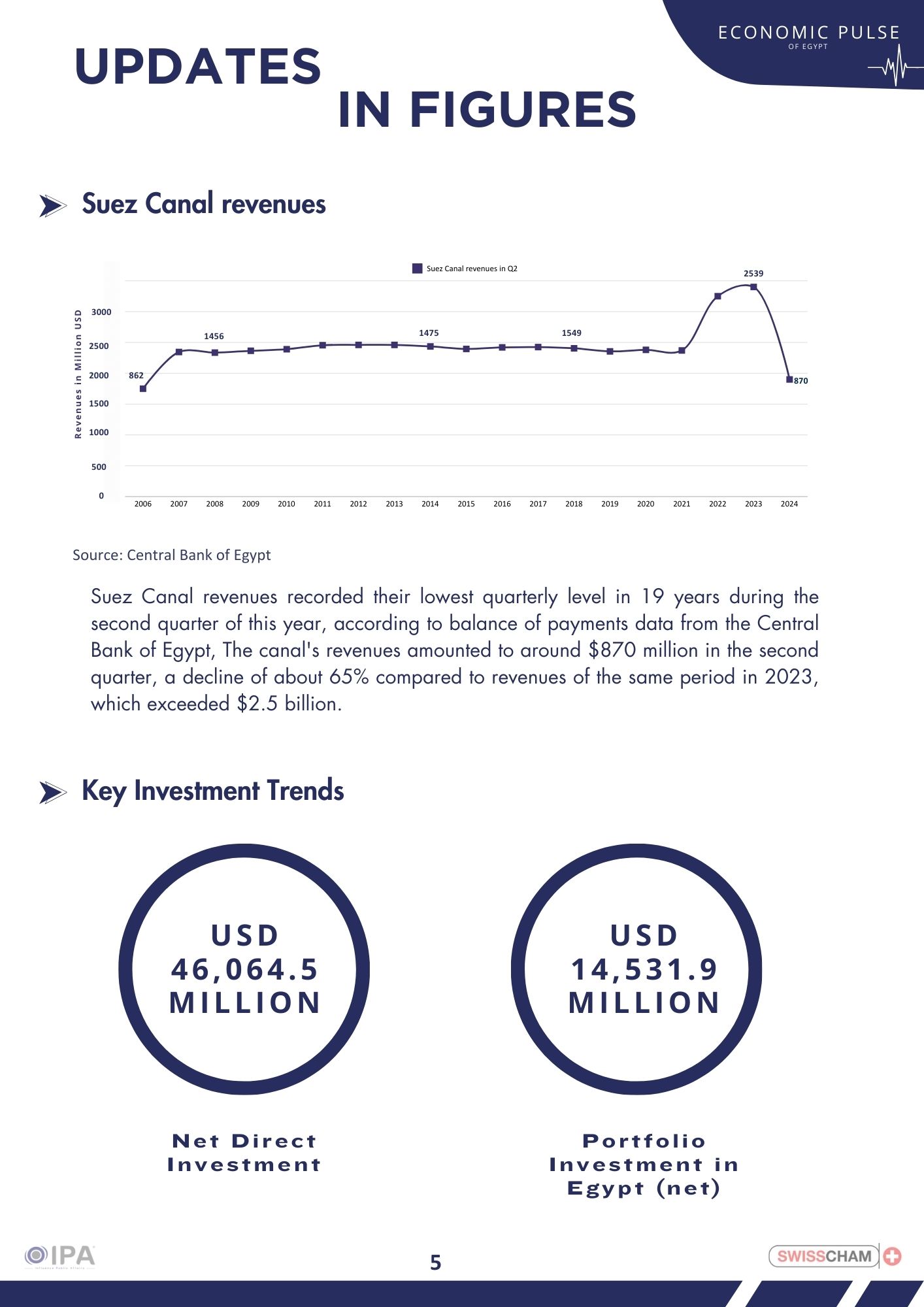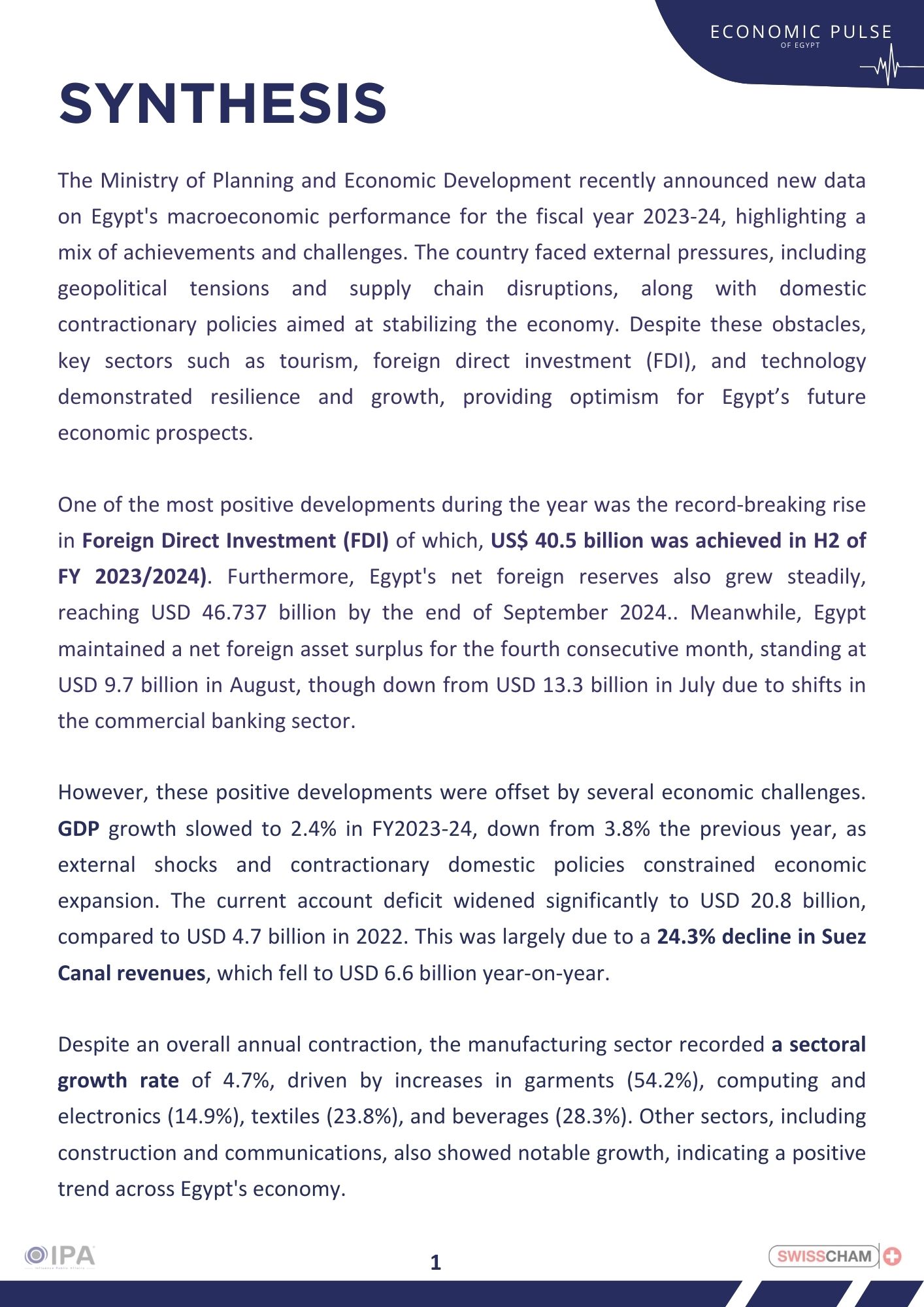 However, these positive developments were offset by several economic challenges. GDP growth slowed to 2.4% in FY2023-24, down from 3.8% the previous year, as external shocks and contractionary domestic policies constrained economic expansion. The current account deficit widened significantly to USD 20.8 billion, compared to USD 4.7 billion in 2022. This was largely due to a 24.3% decline in Suez Canal revenues, which fell to USD 6.6 billion year-on-year.