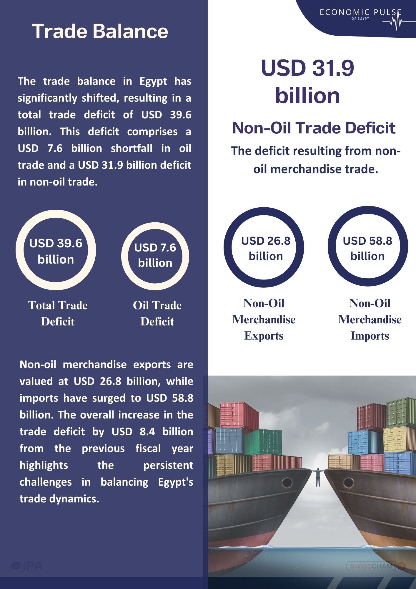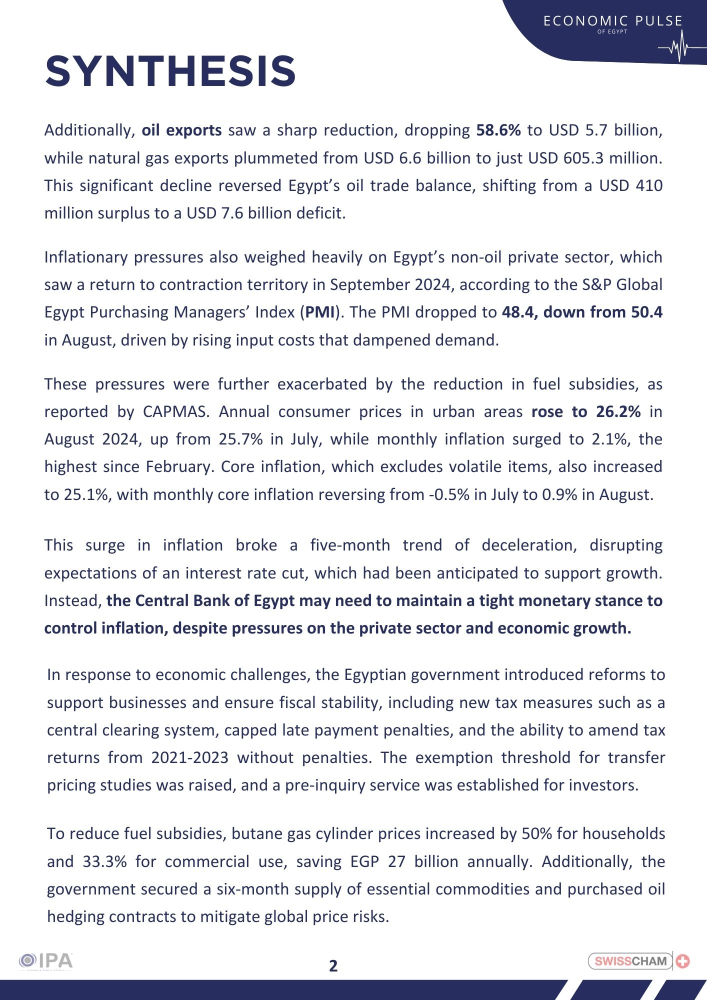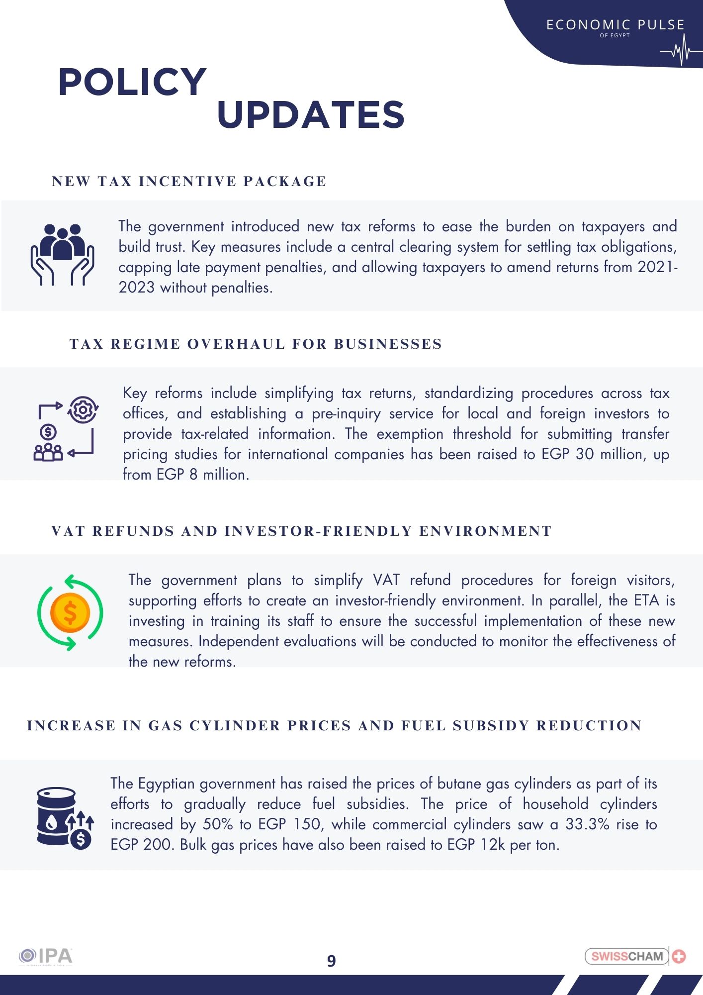 However, these positive developments were offset by several economic challenges. GDP growth slowed to 2.4% in FY2023-24, down from 3.8% the previous year, as external shocks and contractionary domestic policies constrained economic expansion. The current account deficit widened significantly to USD 20.8 billion, compared to USD 4.7 billion in 2022. This was largely due to a 24.3% decline in Suez Canal revenues, which fell to USD 6.6 billion year-on-year.