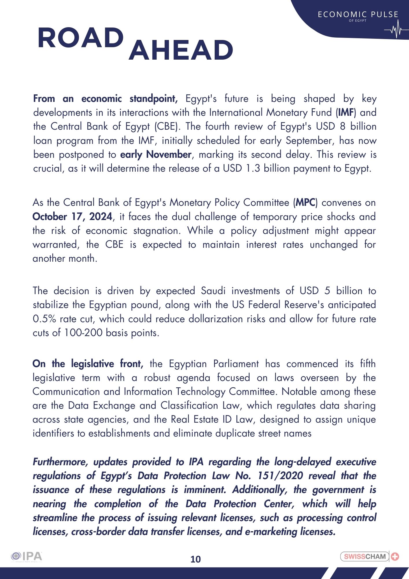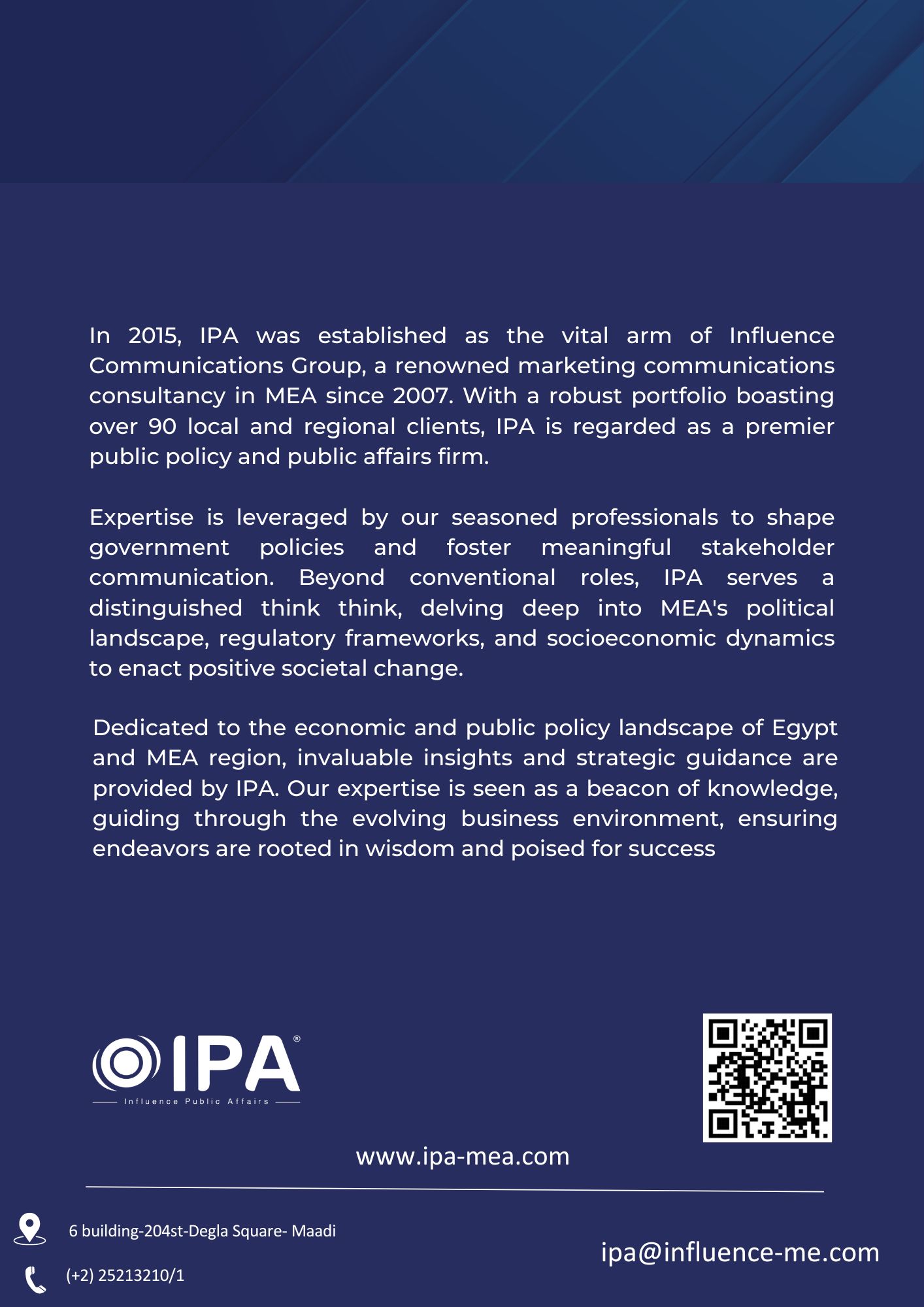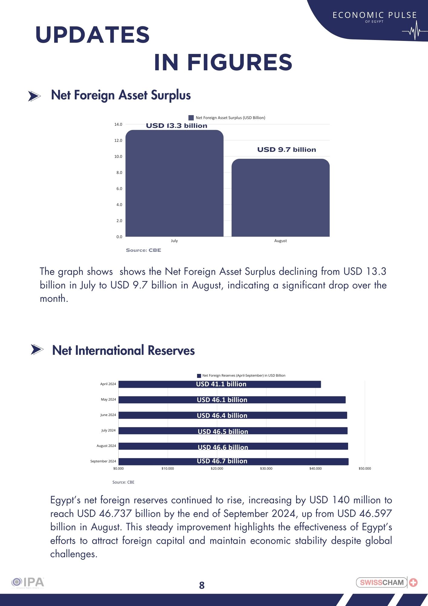 One of the most positive developments during the year was the record-breaking rise in Foreign Direct Investment (FDI) of which, US$ 40.5 billion was achieved in H2 of FY 2023/2024). Furthermore, Egypt's net foreign reserves also grew steadily, reaching USD 46.737 billion by the end of September 2024.. Meanwhile, Egypt maintained a net foreign asset surplus for the fourth consecutive month, standing at USD 9.7 billion in August, though down from USD 13.3 billion in July due to shifts in the commercial banking sector.