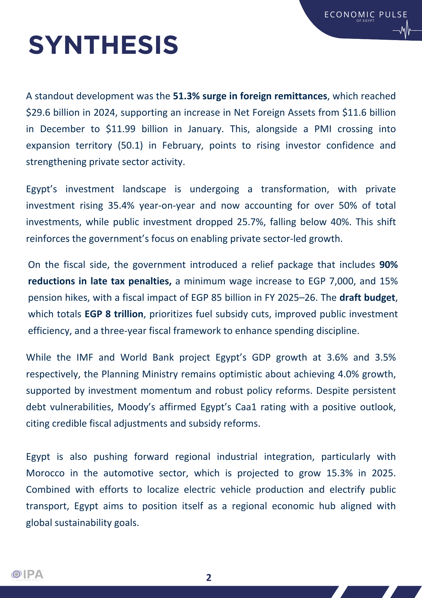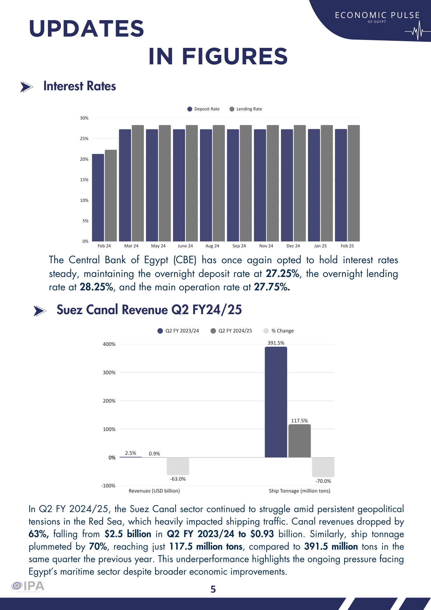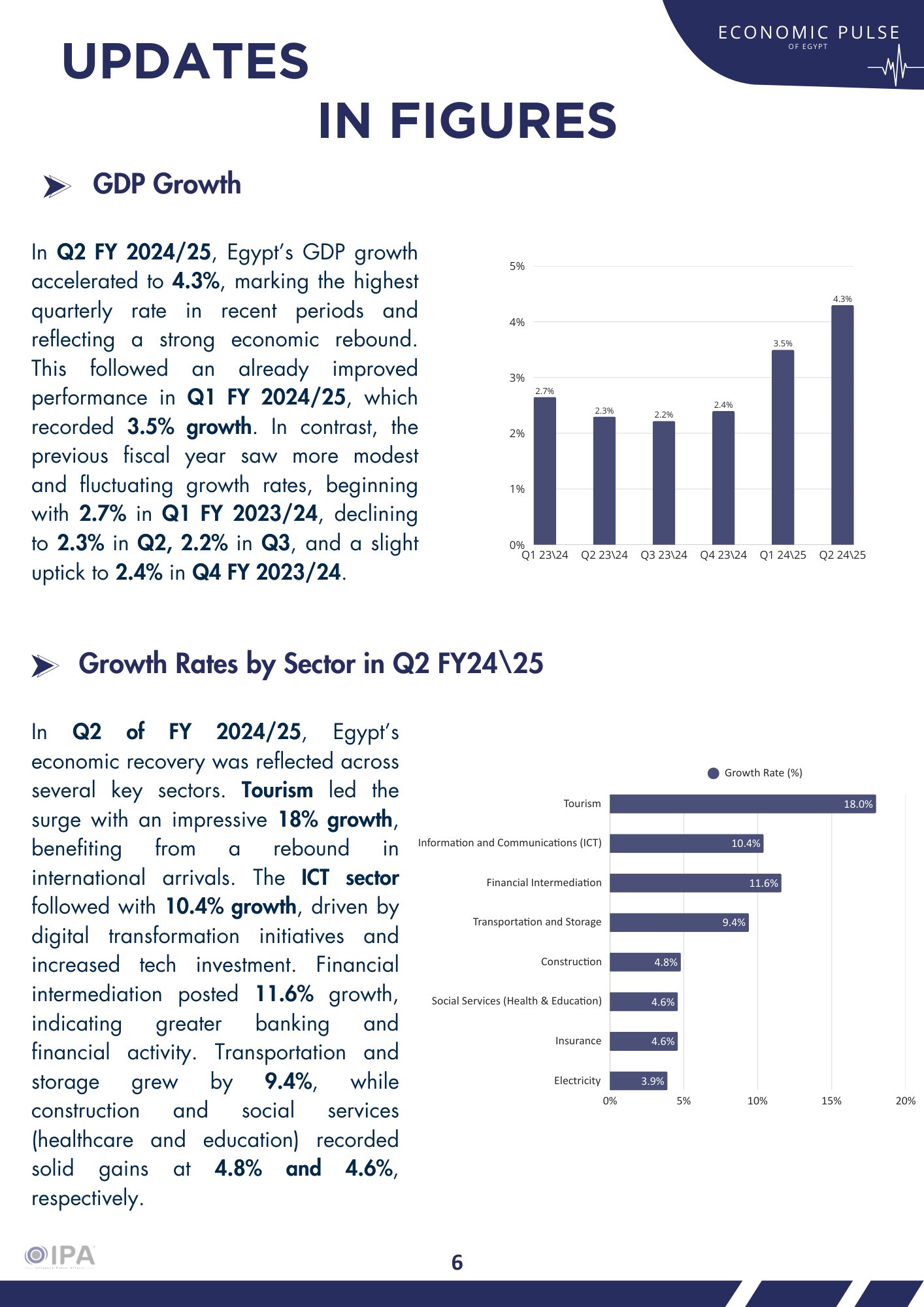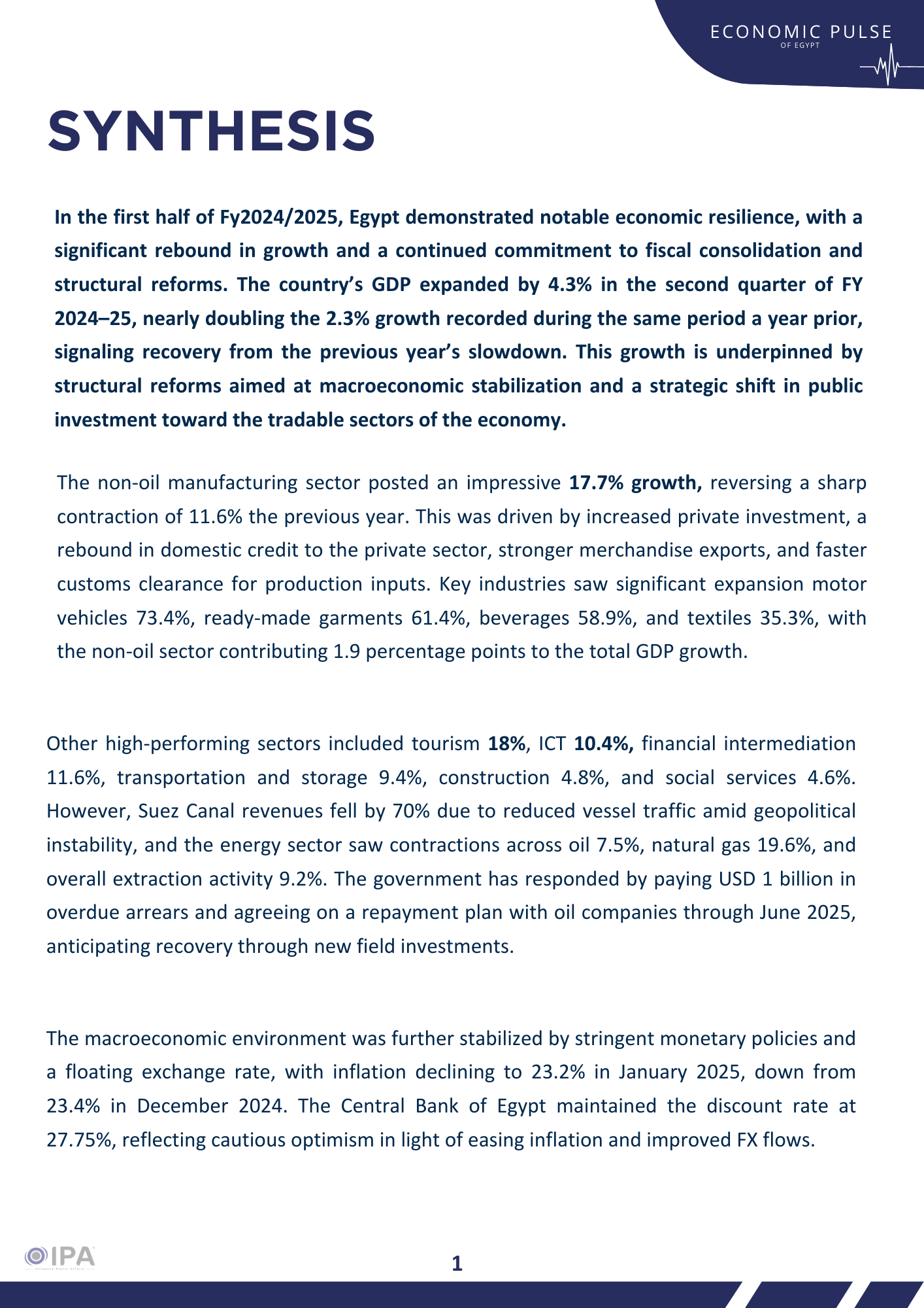 In the first half of Fy2024/2025, Egypt demonstrated notable economic resilience, with a significant rebound in growth and a continued commitment to fiscal consolidation and structural reforms. The country’s GDP expanded by 4.3% in the second quarter of FY 2024–25, nearly doubling the 2.3% growth recorded during the same period a year prior, signaling recovery from the previous year’s slowdown. This growth is underpinned by structural reforms aimed at macroeconomic stabilization and a strategic shift in public investment toward the tradable sectors of the economy.