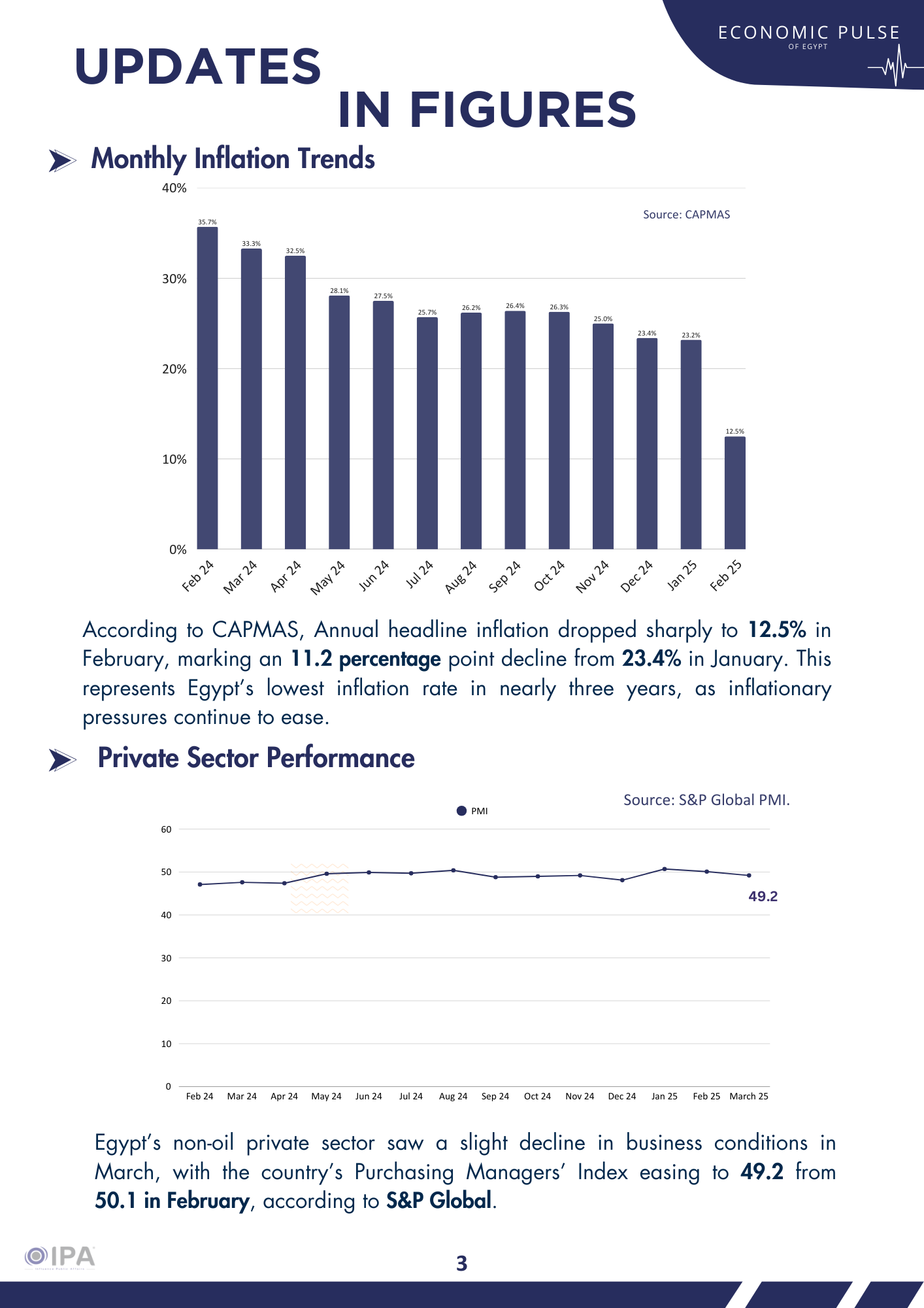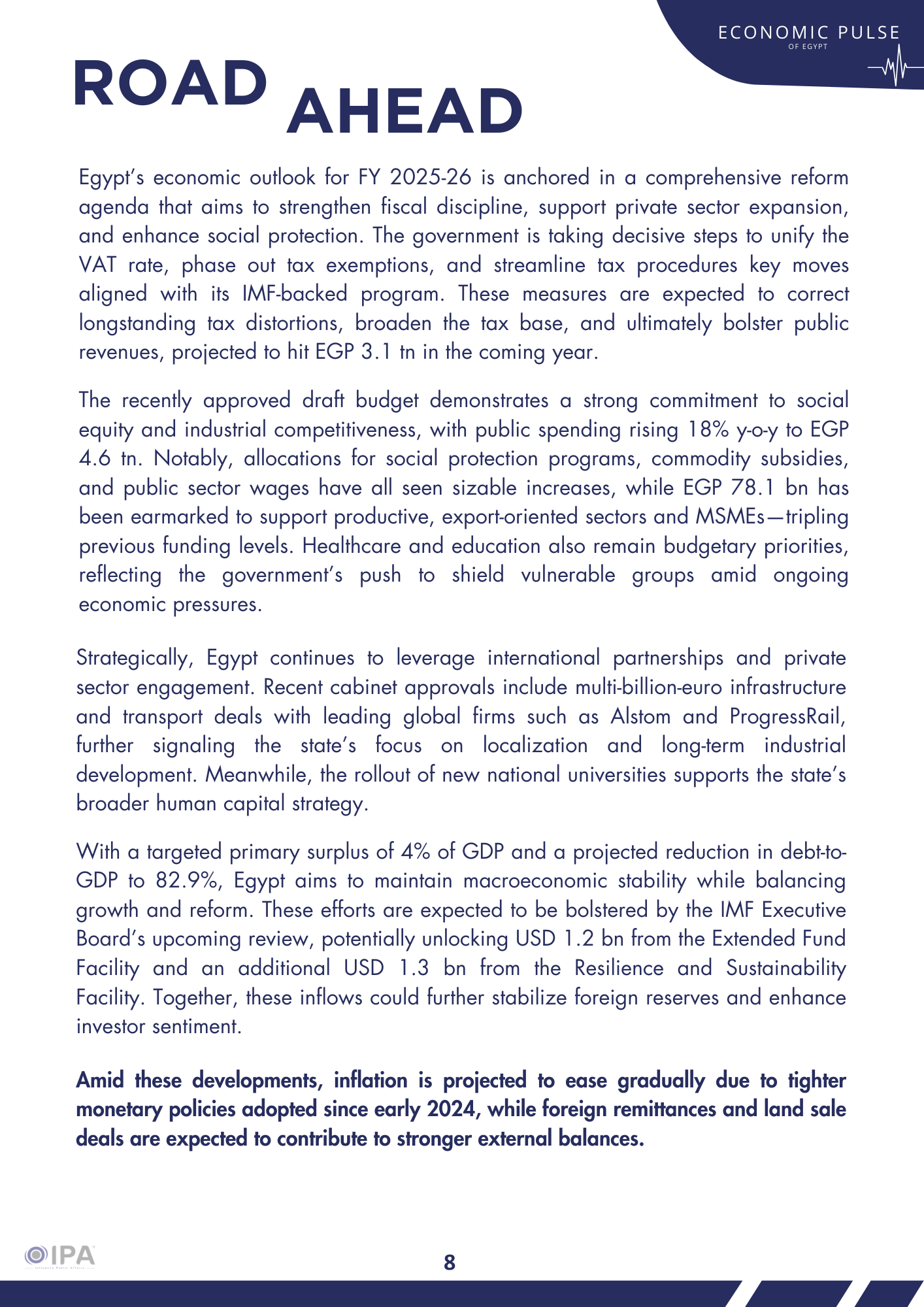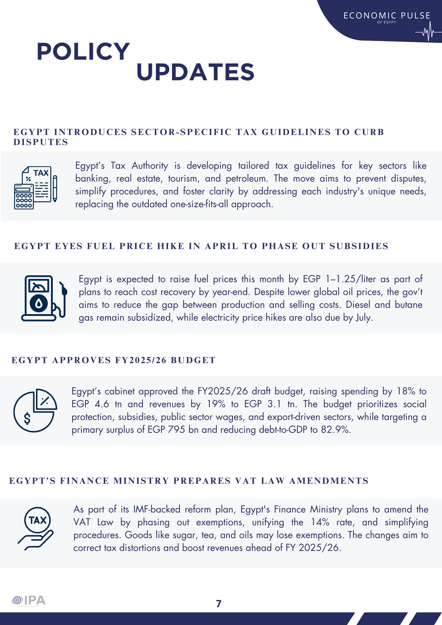 Other high-performing sectors included tourism 18%, ICT 10.4%, financial intermediation 11.6%, transportation and storage 9.4%, construction 4.8%, and social services 4.6%. However, Suez Canal revenues fell by 70% due to reduced vessel traffic amid geopolitical instability, and the energy sector saw contractions across oil 7.5%, natural gas 19.6%, and overall extraction activity 9.2%. The government has responded by paying USD 1 billion in overdue arrears and agreeing on a repayment plan with oil companies through June 2025, anticipating recovery through new field investments.