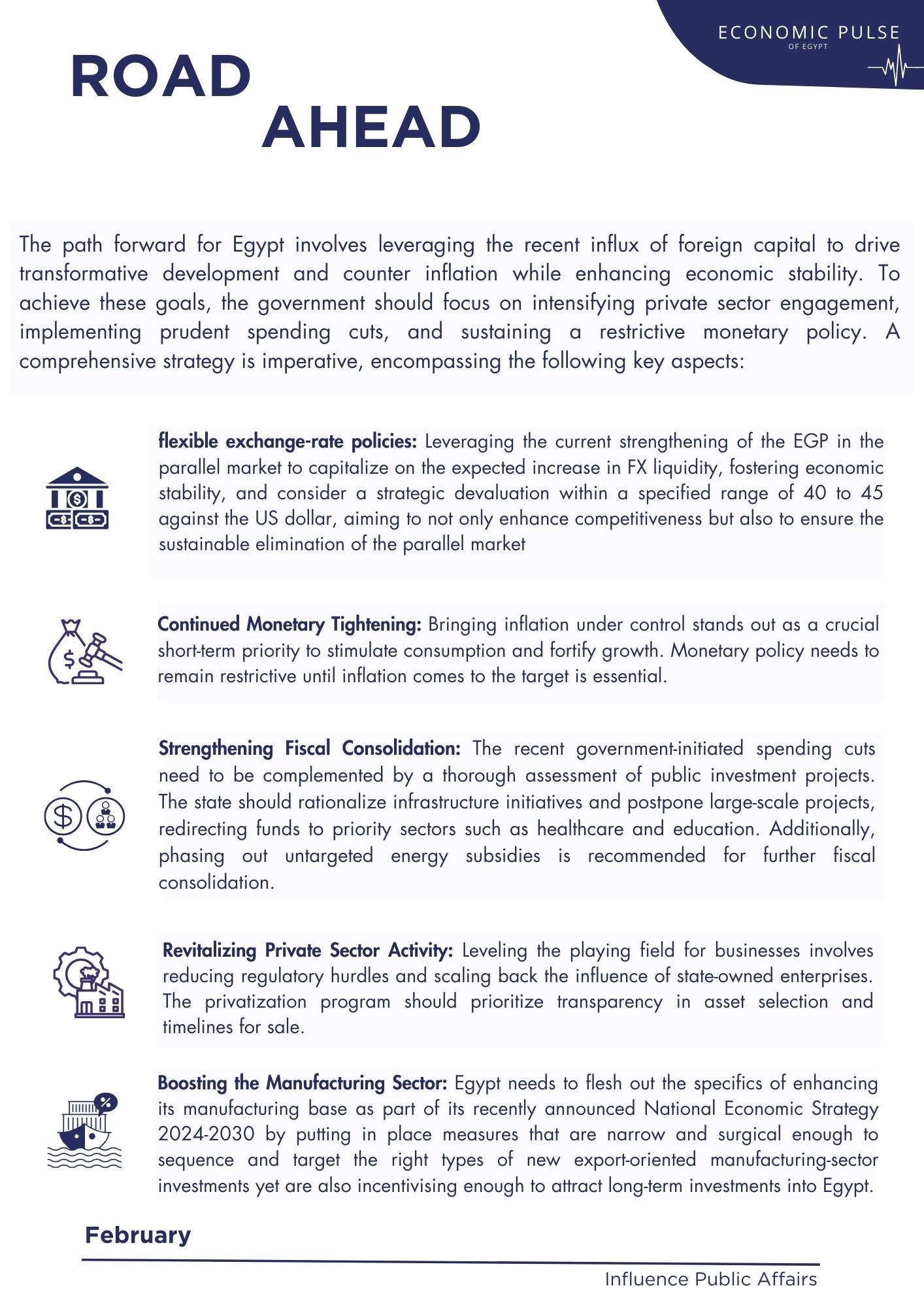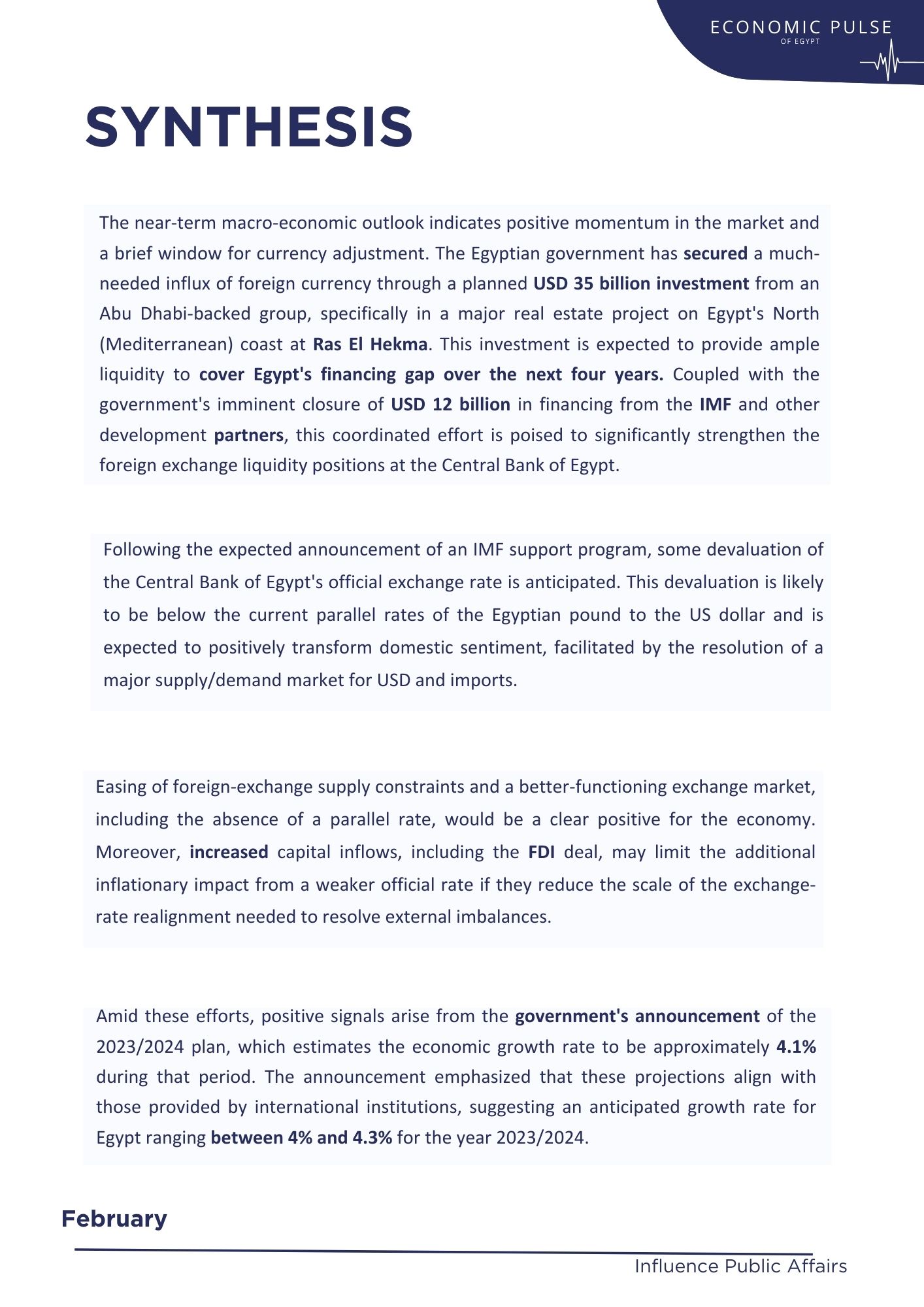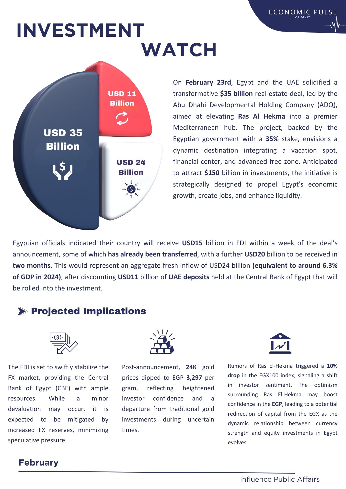 The near-term macro-economic outlook indicates positive momentum in the market and a brief window for currency adjustment. The Egyptian government has secured a much-needed influx of foreign currency through a planned USD 35 billion investment from an Abu Dhabi-backed group, specifically in a major real estate project on Egypt's North (Mediterranean) coast at Ras El Hekma. This investment is expected to provide ample liquidity to cover Egypt's financing gap over the next four years. Coupled with the government's imminent closure of USD 12 billion in financing from the IMF and other development partners, this coordinated effort is poised to significantly strengthen the foreign exchange liquidity positions at the Central Bank of Egypt.