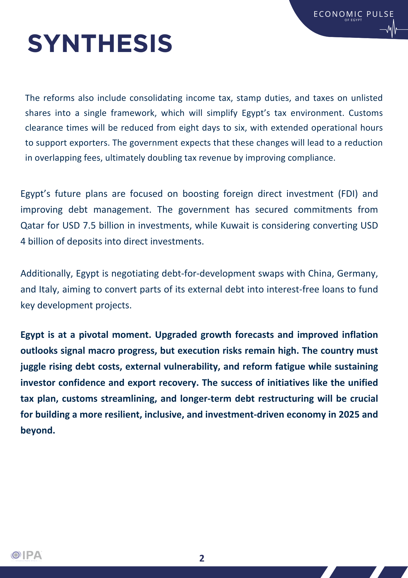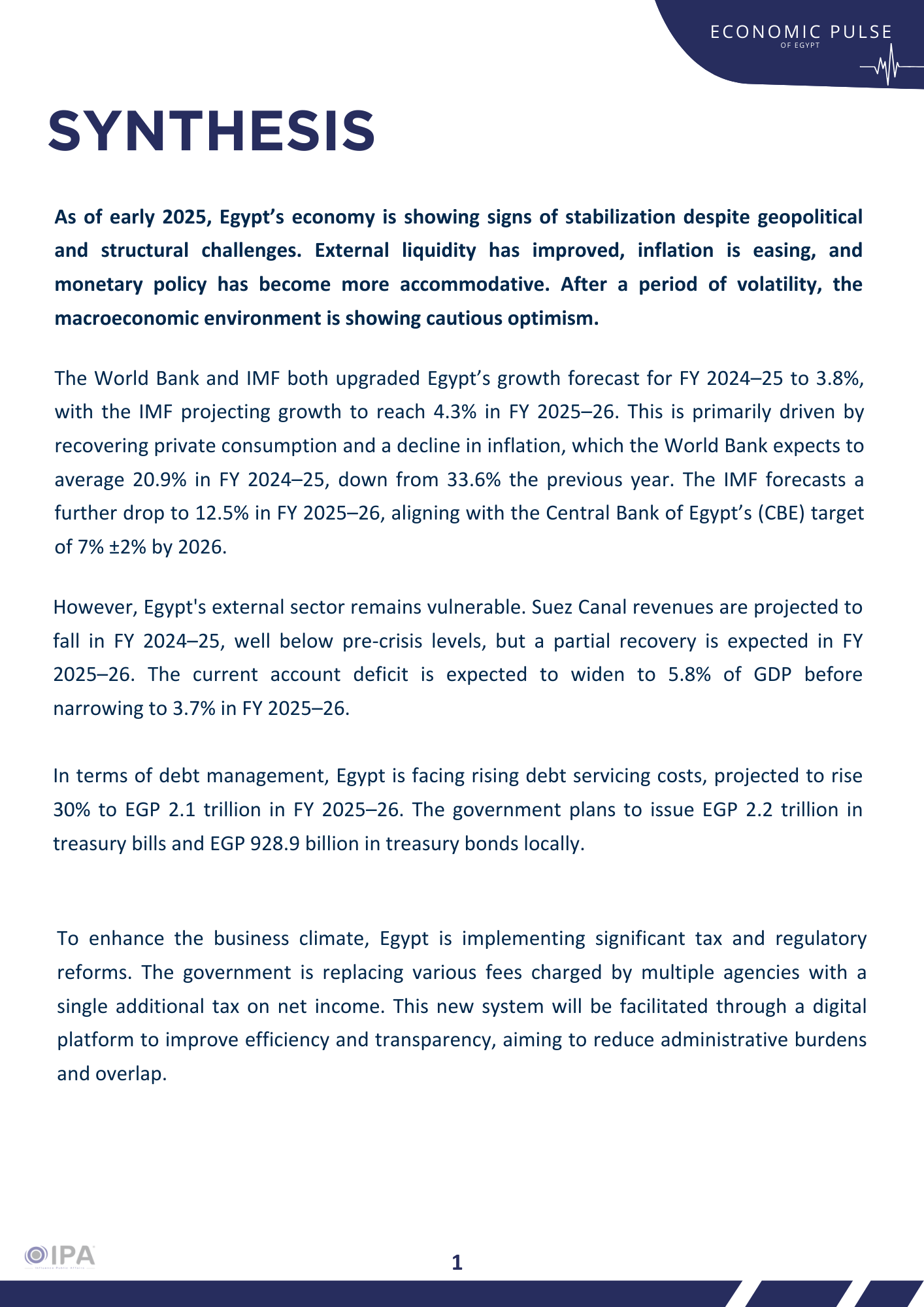 As of early 2025, Egypt’s economy is showing signs of stabilization despite geopolitical and structural challenges. External liquidity has improved, inflation is easing, and monetary policy has become more accommodative. After a period of volatility, the macroeconomic environment is showing cautious optimism.