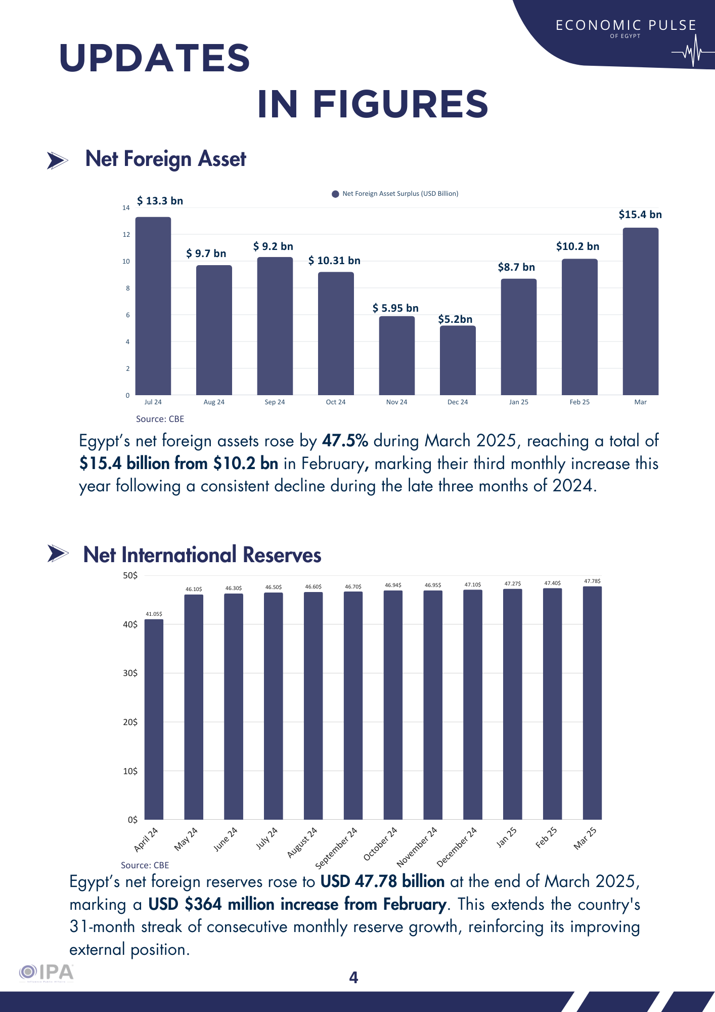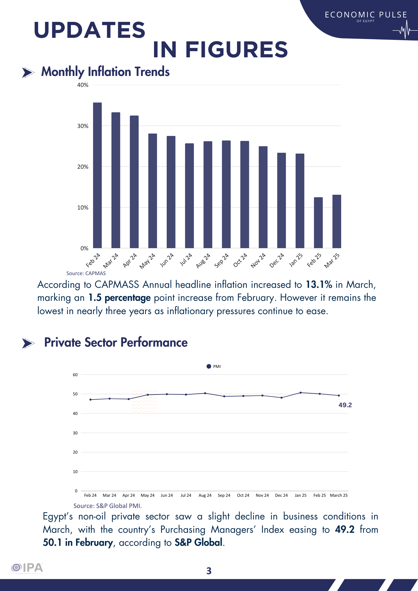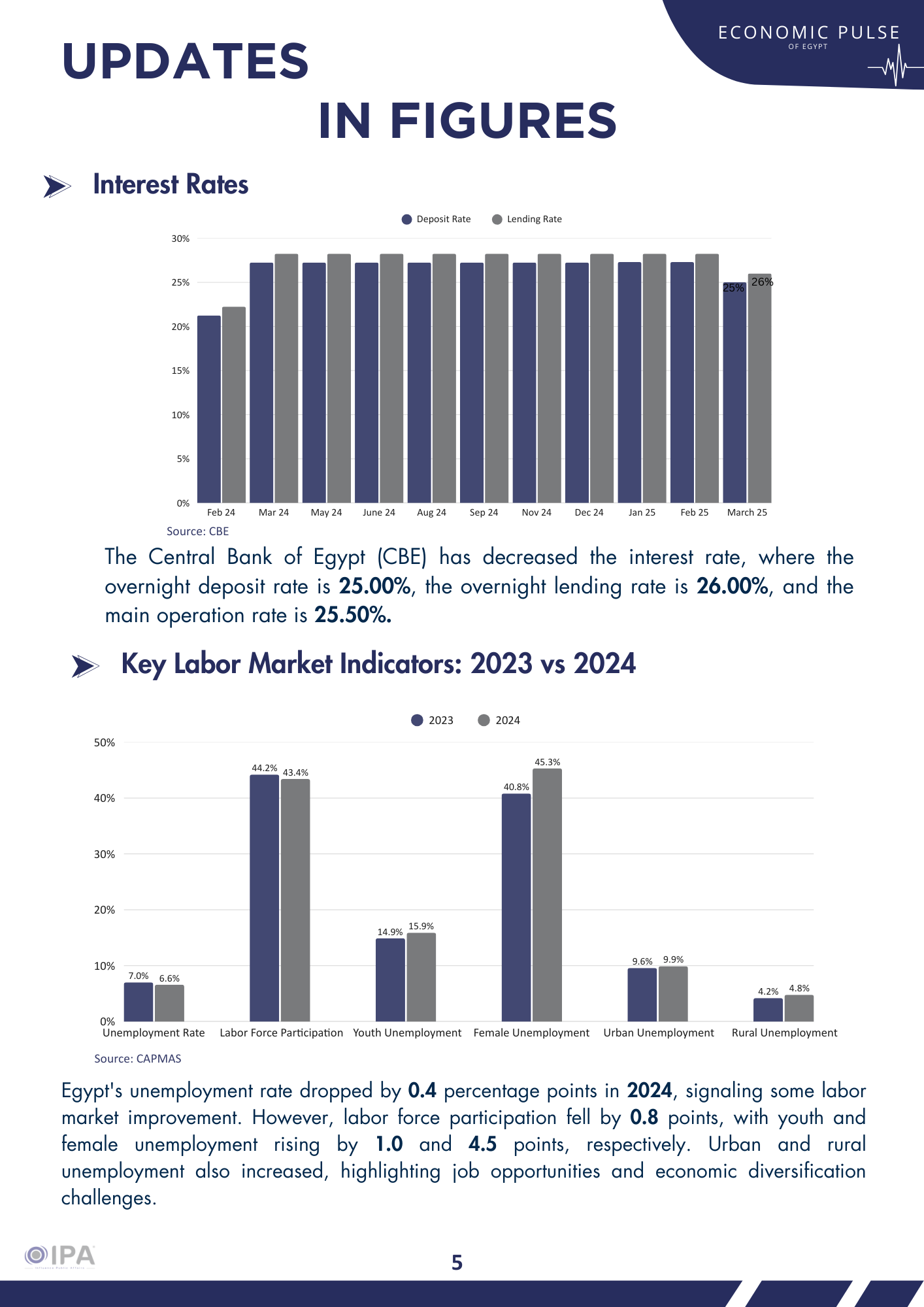The World Bank and IMF both upgraded Egypt’s growth forecast for FY 2024–25 to 3.8%, with the IMF projecting growth to reach 4.3% in FY 2025–26. This is primarily driven by recovering private consumption and a decline in inflation, which the World Bank expects to average 20.9% in FY 2024–25, down from 33.6% the previous year. The IMF forecasts a further drop to 12.5% in FY 2025–26, aligning with the Central Bank of Egypt’s (CBE) target of 7% ±2% by 2026.