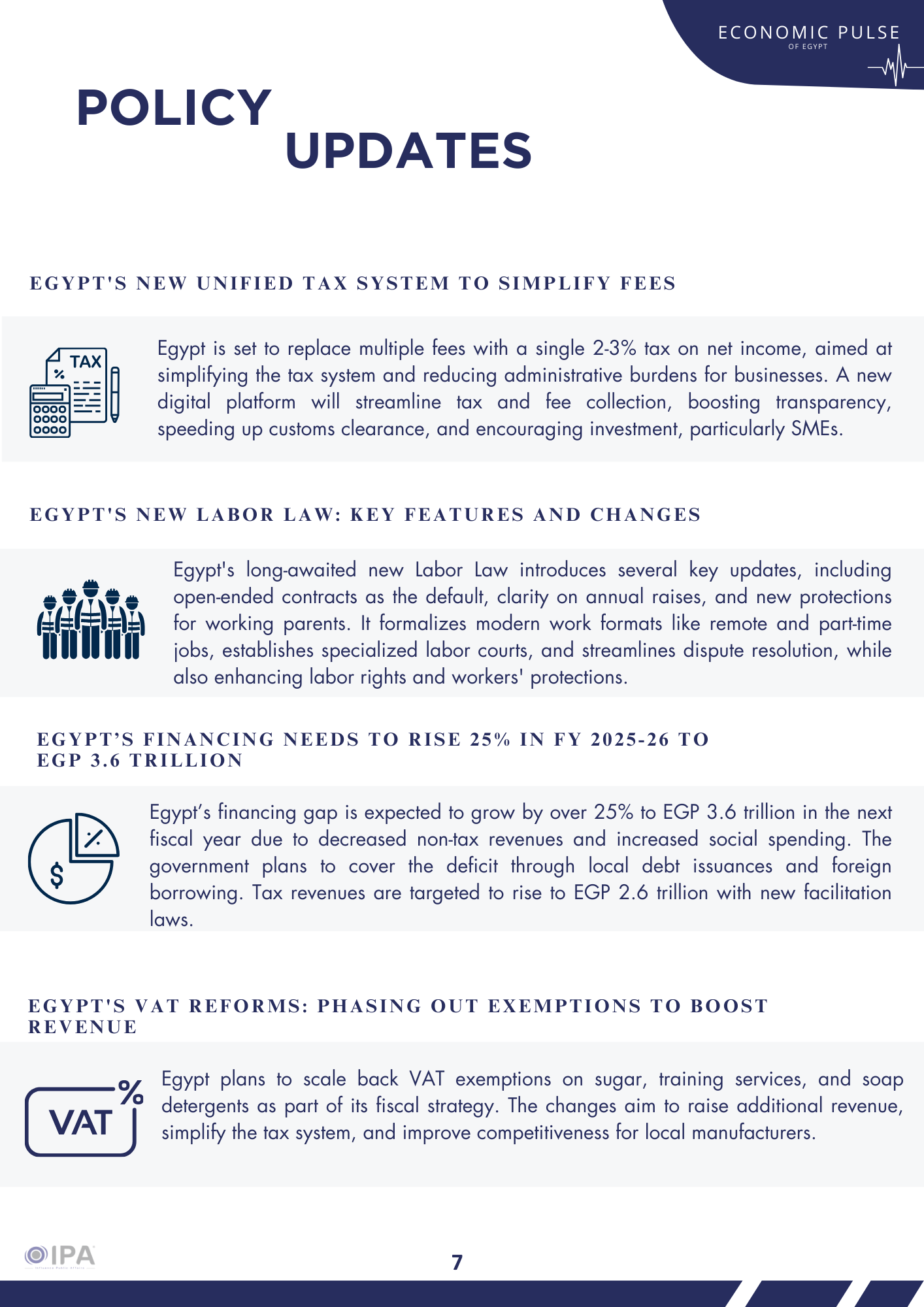 To enhance the business climate, Egypt is implementing significant tax and regulatory reforms. The government is replacing various fees charged by multiple agencies with a single additional tax on net income. This new system will be facilitated through a digital platform to improve efficiency and transparency, aiming to reduce administrative burdens and overlap.