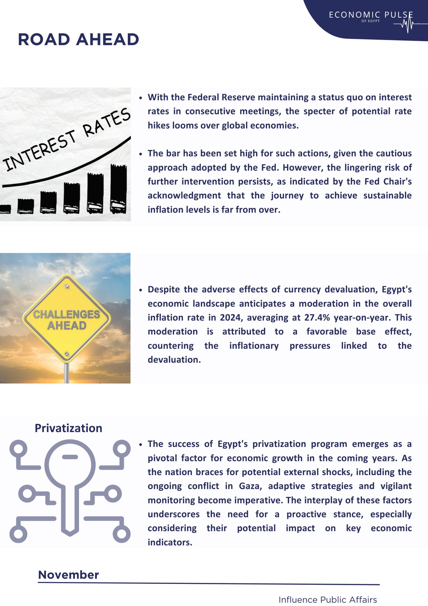 In the realm of monetary policy, both globally and domestically, significant decisions have shaped the economic narrative. The American Federal Reserve's choice to maintain interest rates for the second consecutive meeting is mirrored by Egypt's Central Bank, which opted to keep key policy rates unchanged. This alignment reflects the efficacy of fiscal tightening policies in mitigating inflation without triggering adverse economic outcomes.