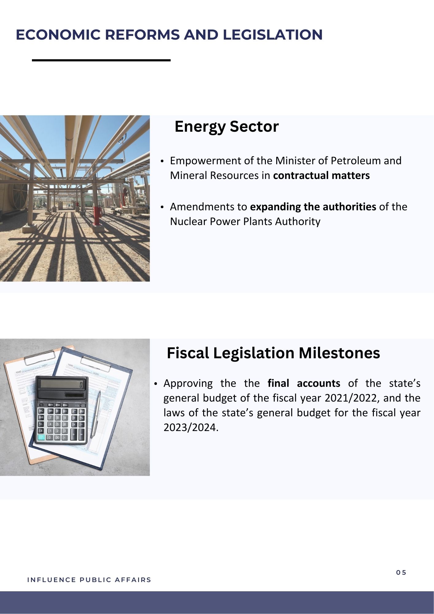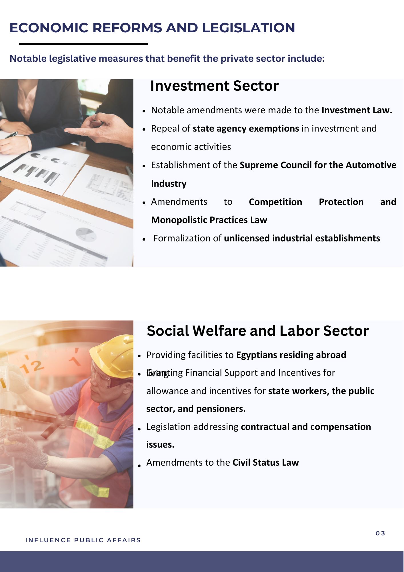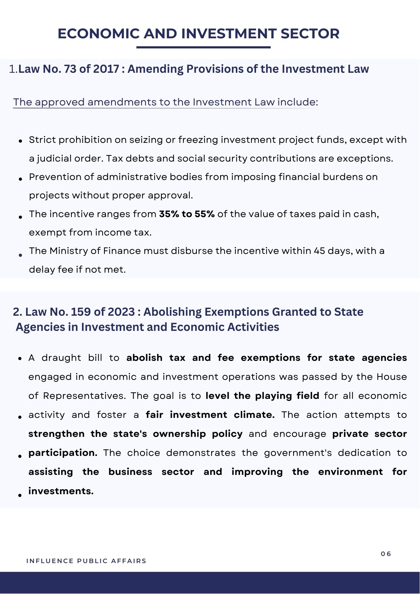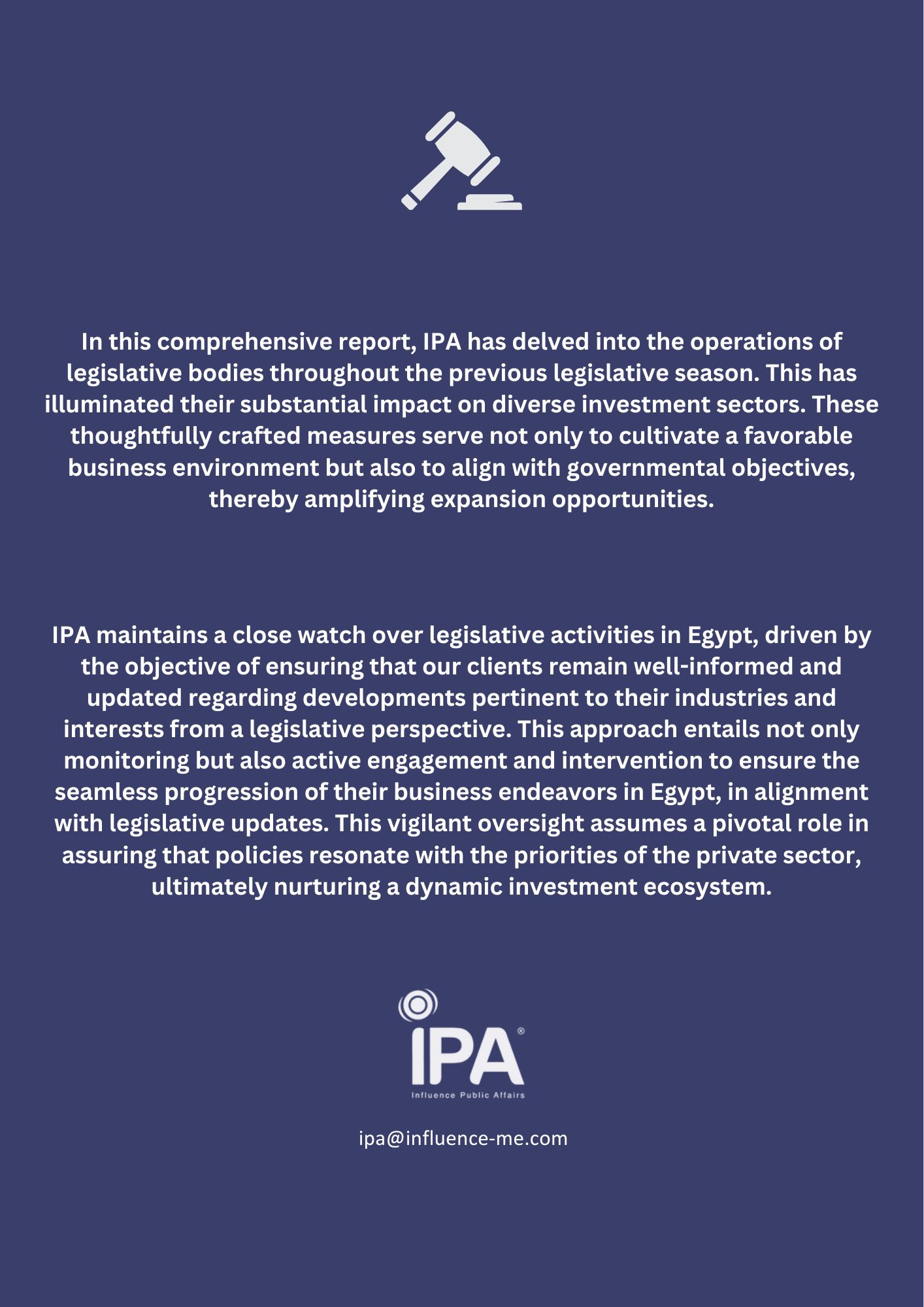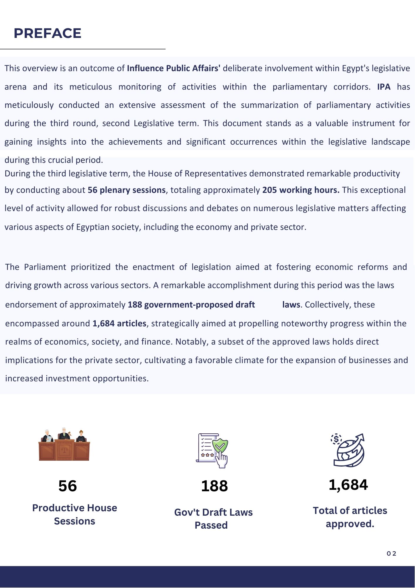 This overview is an outcome of Influence Public Affairs' deliberate involvement within Egypt's legislative arena and its meticulous monitoring of activities within the parliamentary corridors. IPA has meticulously conducted an extensive assessment of the summarization of parliamentary activities during the third round, second Legislative term. This document stands as a valuable instrument for gaining insights into the achievements and significant occurrences within the legislative landscape during this crucial period