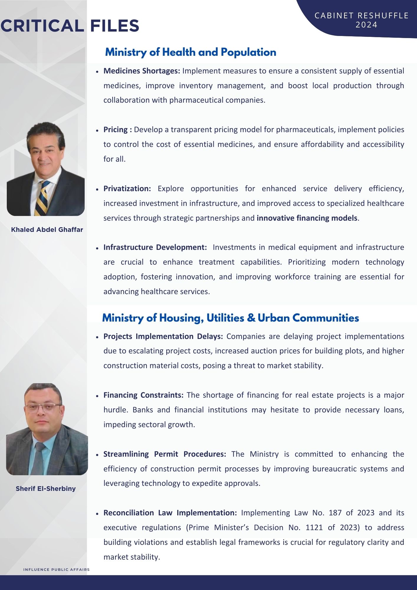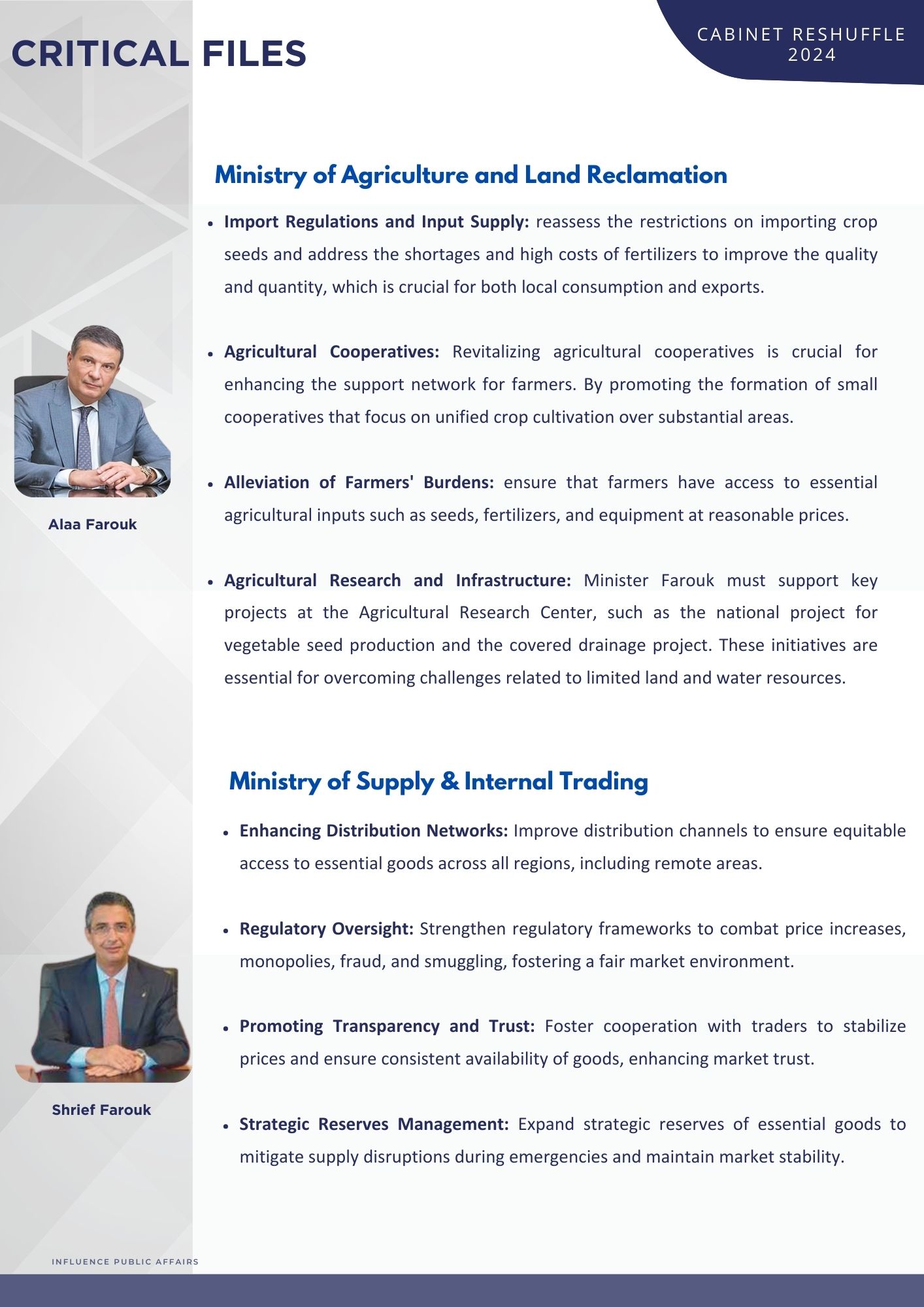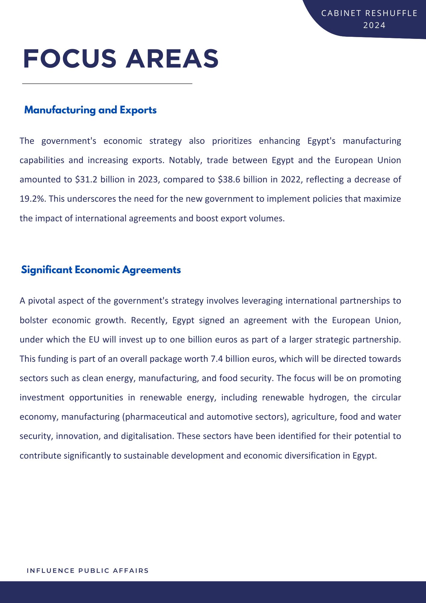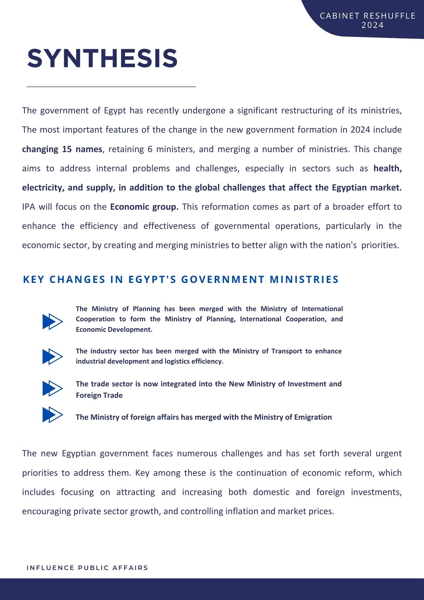 The government of Egypt has recently undergone a significant restructuring of its ministries, The most important features of the change in the new government formation in 2024 include changing 15 names, retaining 6 ministers, and merging a number of ministries. This change aims to address internal problems and challenges, especially in sectors such as health, electricity, and supply, in addition to the global challenges that affect the Egyptian market. IPA will focus on the Economic group. This reformation comes as part of a broader effort to enhance the efficiency and effectiveness of governmental operations, particularly in the economic sector, by creating and merging ministries to better align with the nation's priorities.
