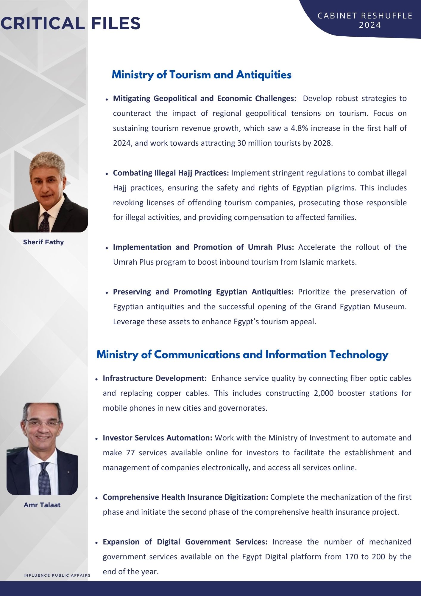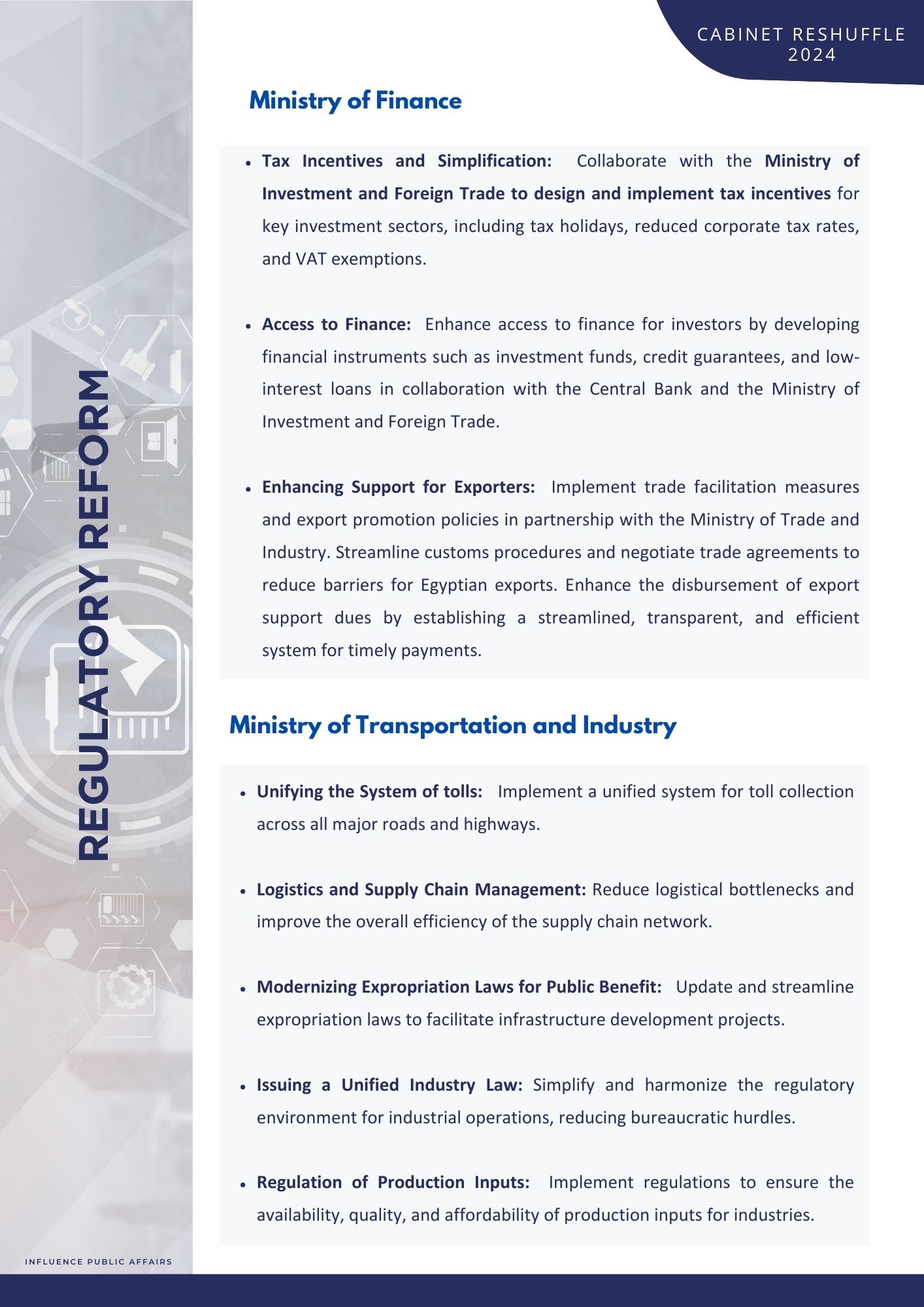 The new Egyptian government faces numerous challenges and has set forth several urgent priorities to address them. Key among these is the continuation of economic reform, which includes focusing on attracting and increasing both domestic and foreign investments, encouraging private sector growth, and controlling inflation and market prices.