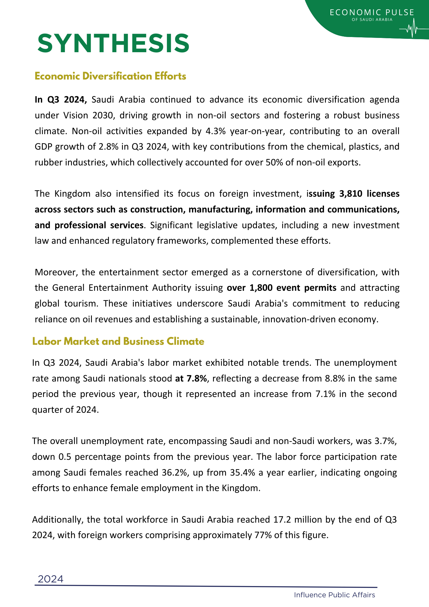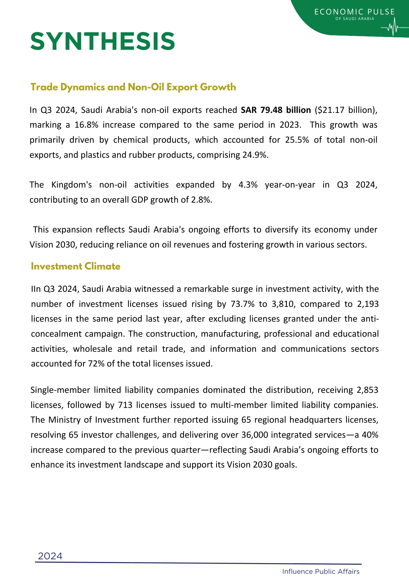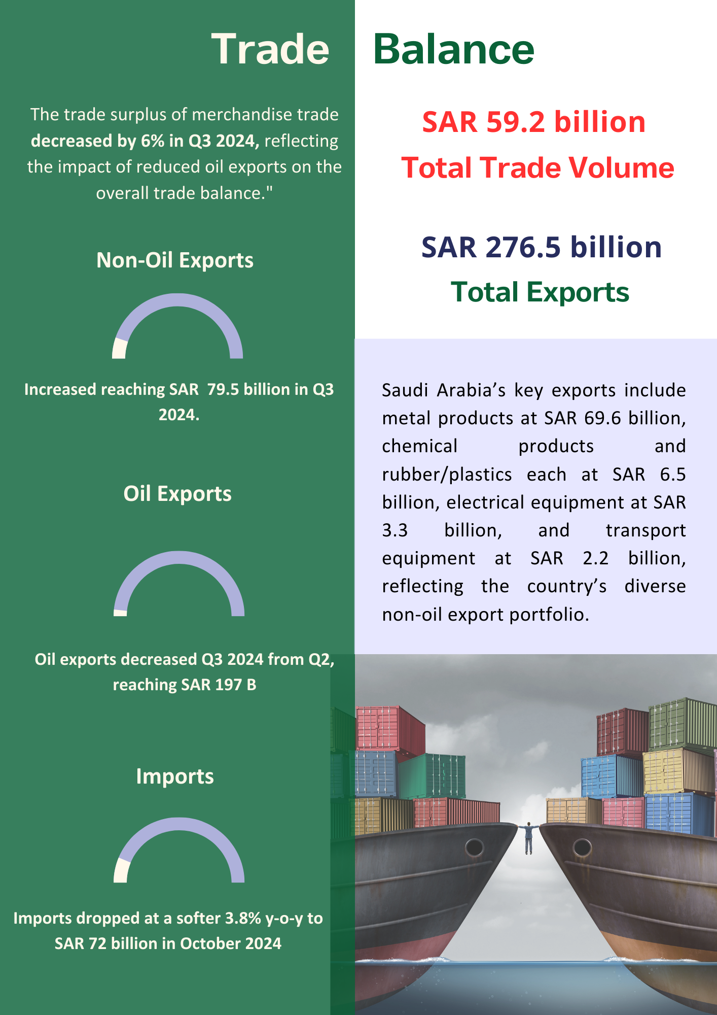 In Q3 2024, Saudi Arabia continued to advance its economic diversification agenda under Vision 2030, driving growth in non-oil sectors and fostering a robust business climate. Non-oil activities expanded by 4.3% year-on-year, contributing to an overall GDP growth of 2.8% in Q3 2024, with key contributions from the chemical, plastics, and rubber industries, which collectively accounted for over 50% of non-oil exports.