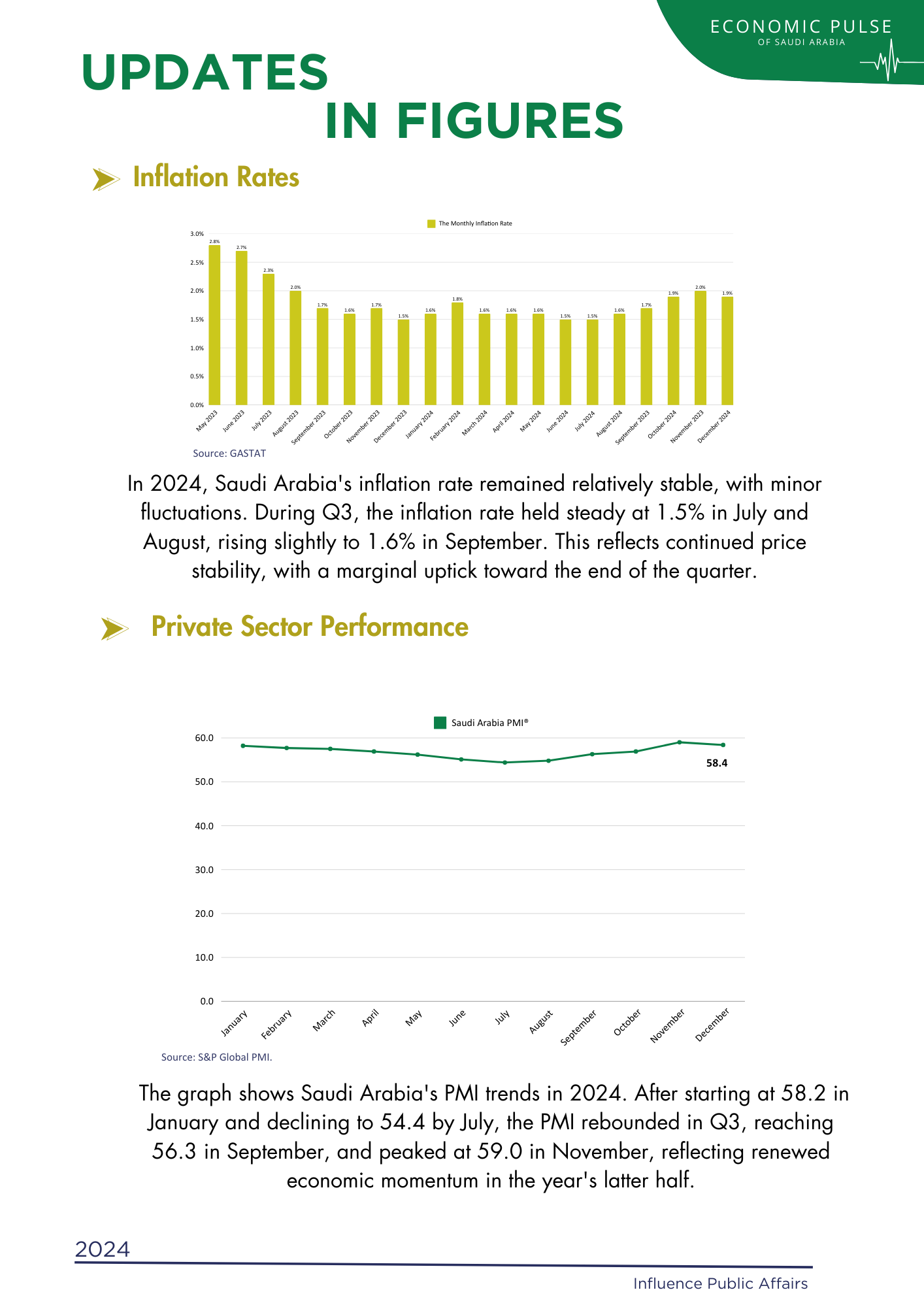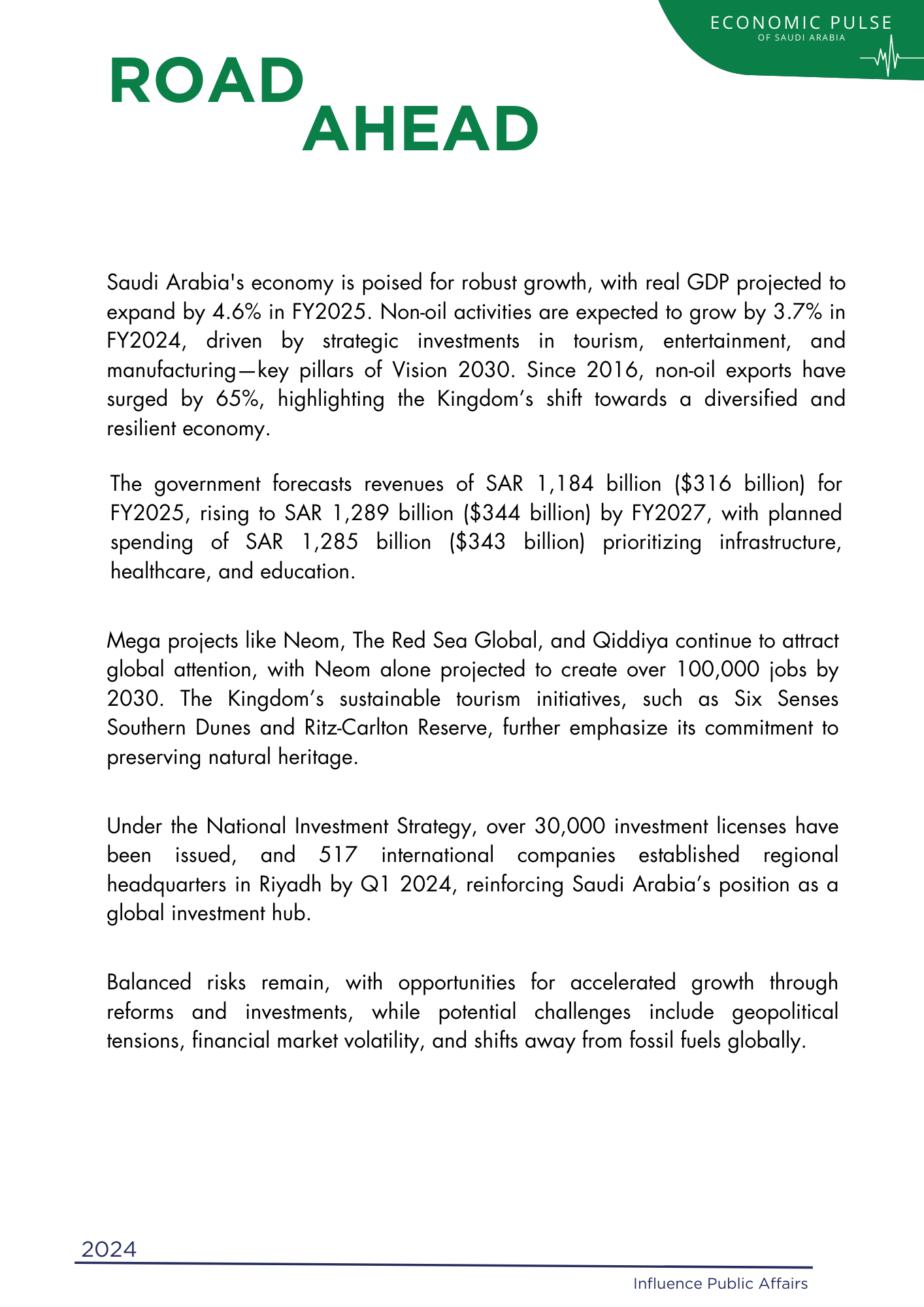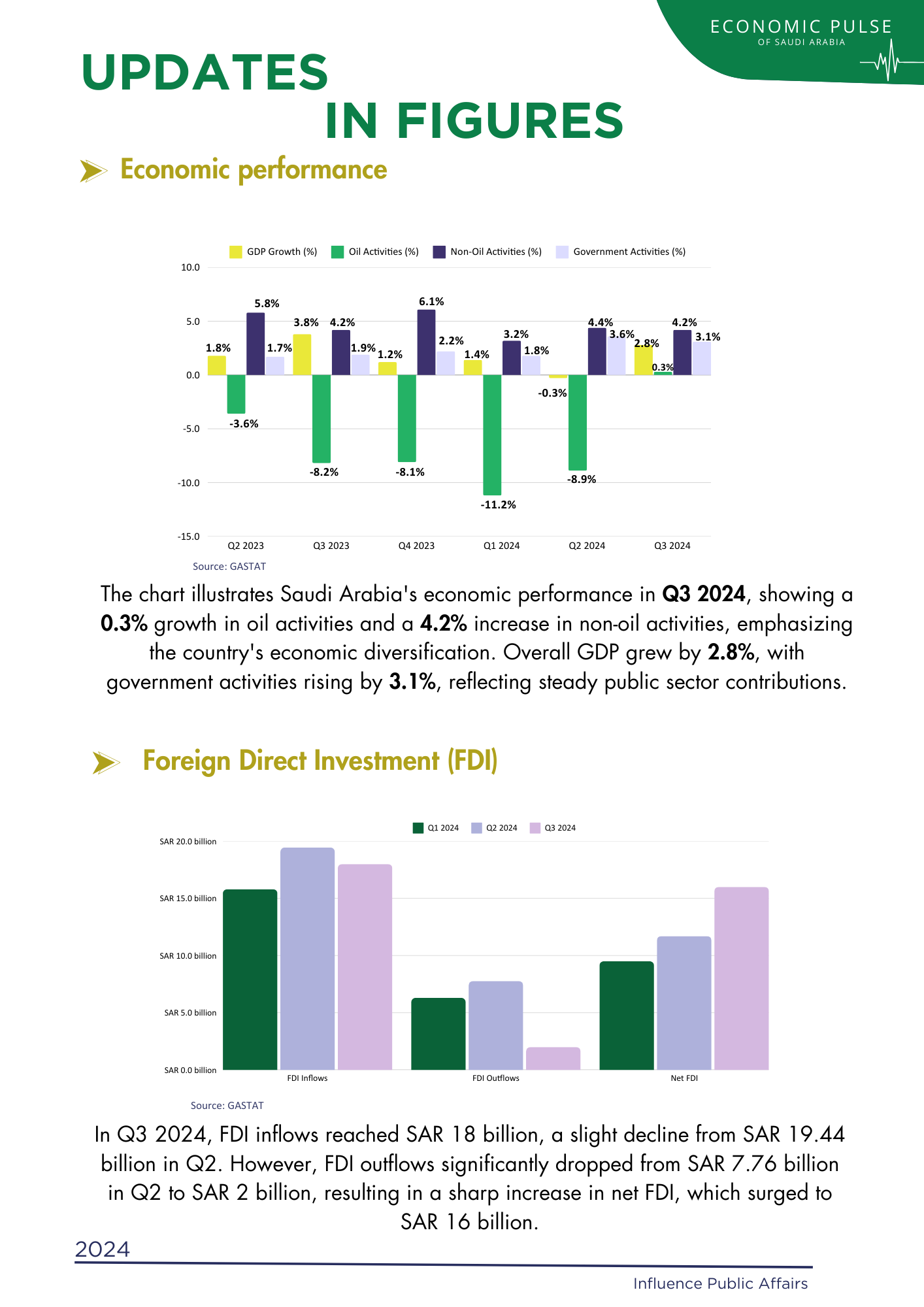 In Q3 2024, Saudi Arabia continued to advance its economic diversification agenda under Vision 2030, driving growth in non-oil sectors and fostering a robust business climate. Non-oil activities expanded by 4.3% year-on-year, contributing to an overall GDP growth of 2.8% in Q3 2024, with key contributions from the chemical, plastics, and rubber industries, which collectively accounted for over 50% of non-oil exports.